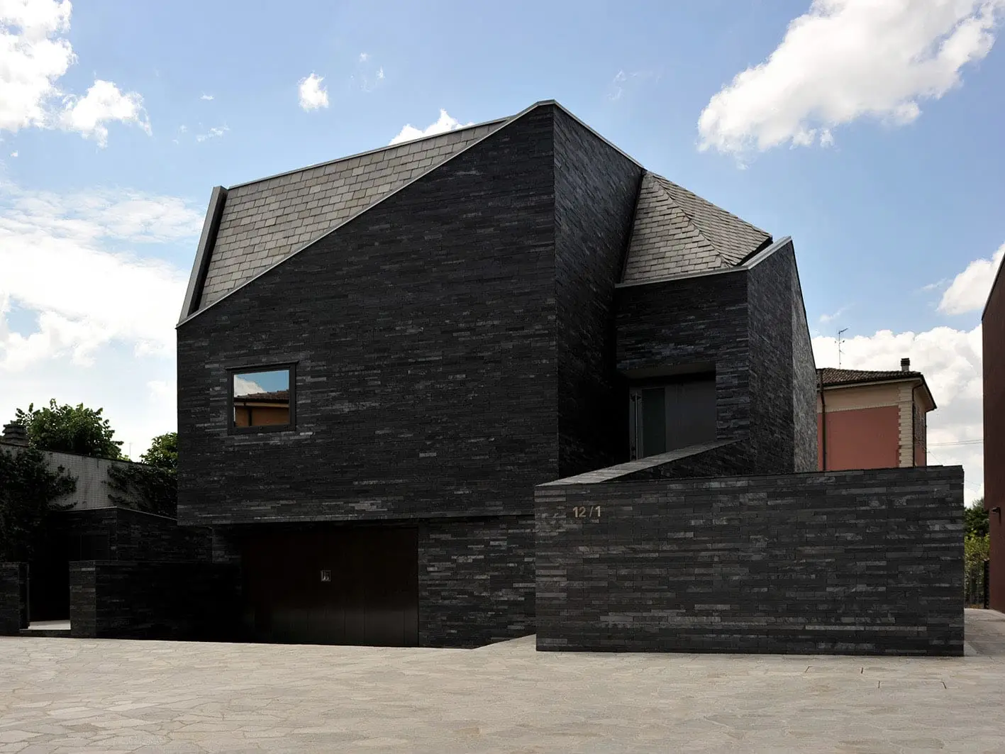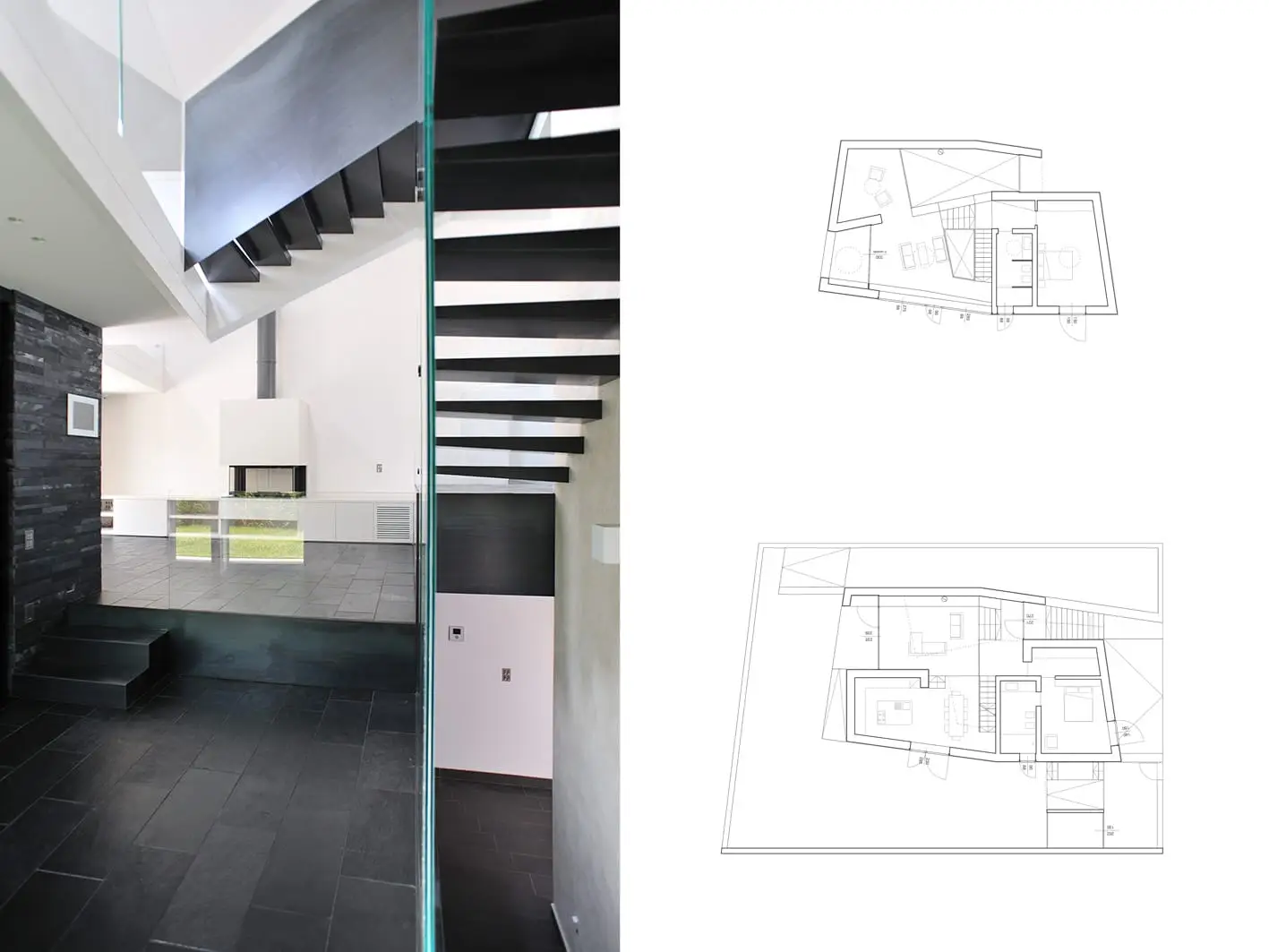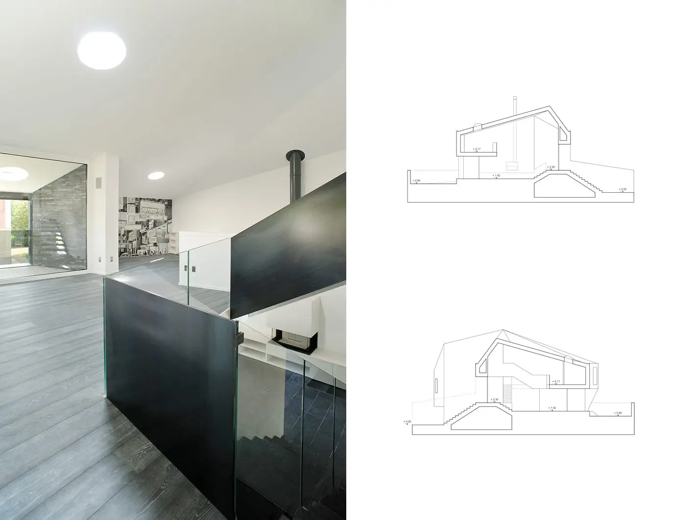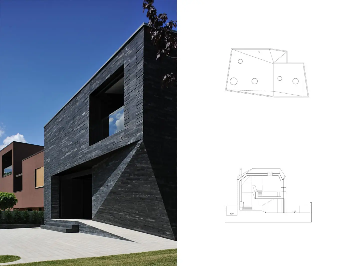 Il progetto realizza il desiderio del committente, Ruggero Fiorella, di abitare una struttura contemporanea, studiata per essere vissuta nella sua totalità, concepita sia in termini di tempo che di spazio. Di conseguenza la forma geometrica è metafora non solo del progetto architettonico ma anche della vita che si trasforma. L’architettura di questa abitazione è stata concepita come uno sviluppo di percorsi dove il movimento da una attività alla successiva diviene il principio germinale del progetto. Questo concetto si esprime creando una serie di rapporti tridimensionali che permettono di fruire gli ambienti come continuo susseguirsi di punti di vista. La casa, sorretta da una struttura portante tradizionale, si presenta come un involucro materico in pietra, materiale che prosegue anche in copertura, accompagnando il plasmarsi delle falde in relazione ai diversi lati del lotto. Le aperture sono rivolte soltanto verso i due lati che garantiscono intimità, a sud verso la campagna e ad ovest verso il muro di confine. Questo concetto permette di vivere il giardino come un ampliamento della zona giorno, in particolare nella zona a sud, dove un sistema di spazi pavimentati in ceramica raccordano le diverse quote del giardino esterno con la loggia che, senza soluzione di continuità, si relaziona con il soggiorno interno. Il doppio volume e il frammentarsi della scala divengono elementi fondamentali: essi uniscono gli ambienti posti su livelli diversi, spesso con poche alzate, “obbligando” il fruitore a vivere la quotidianità della casa in modo dinamico ed oltrepassando uno spazio per raggiungerne un altro spazio e un altro ancora.