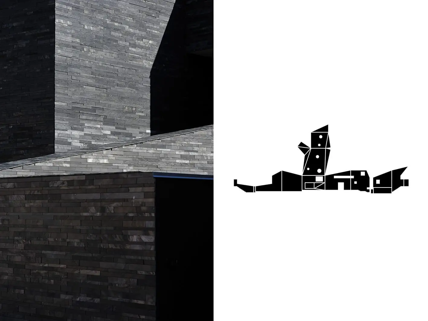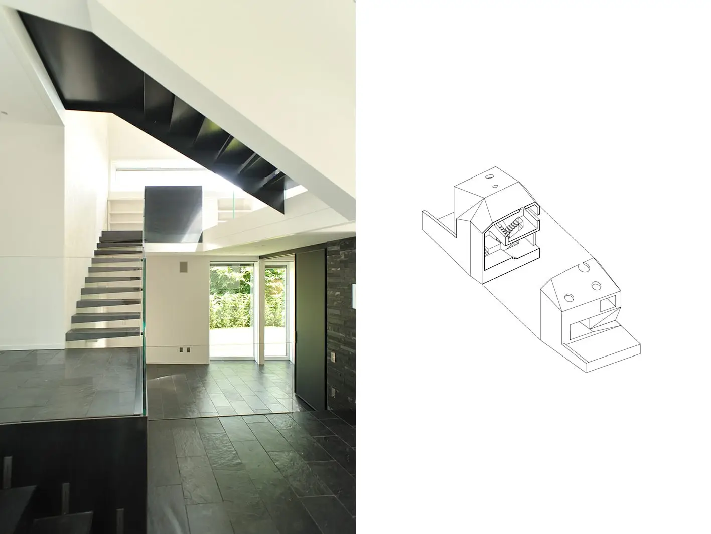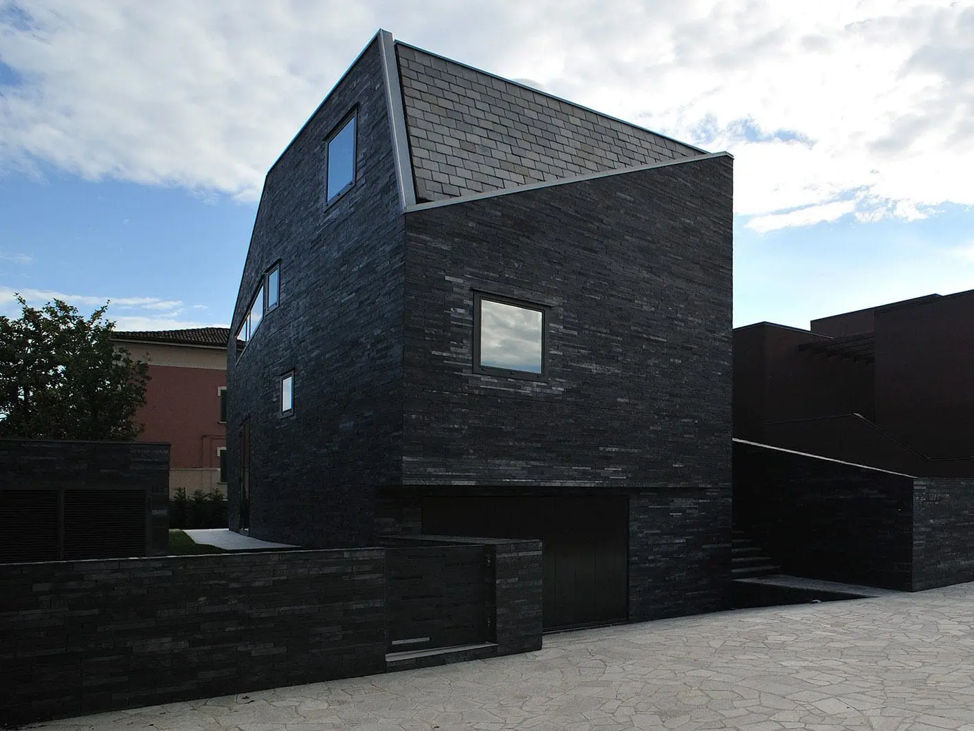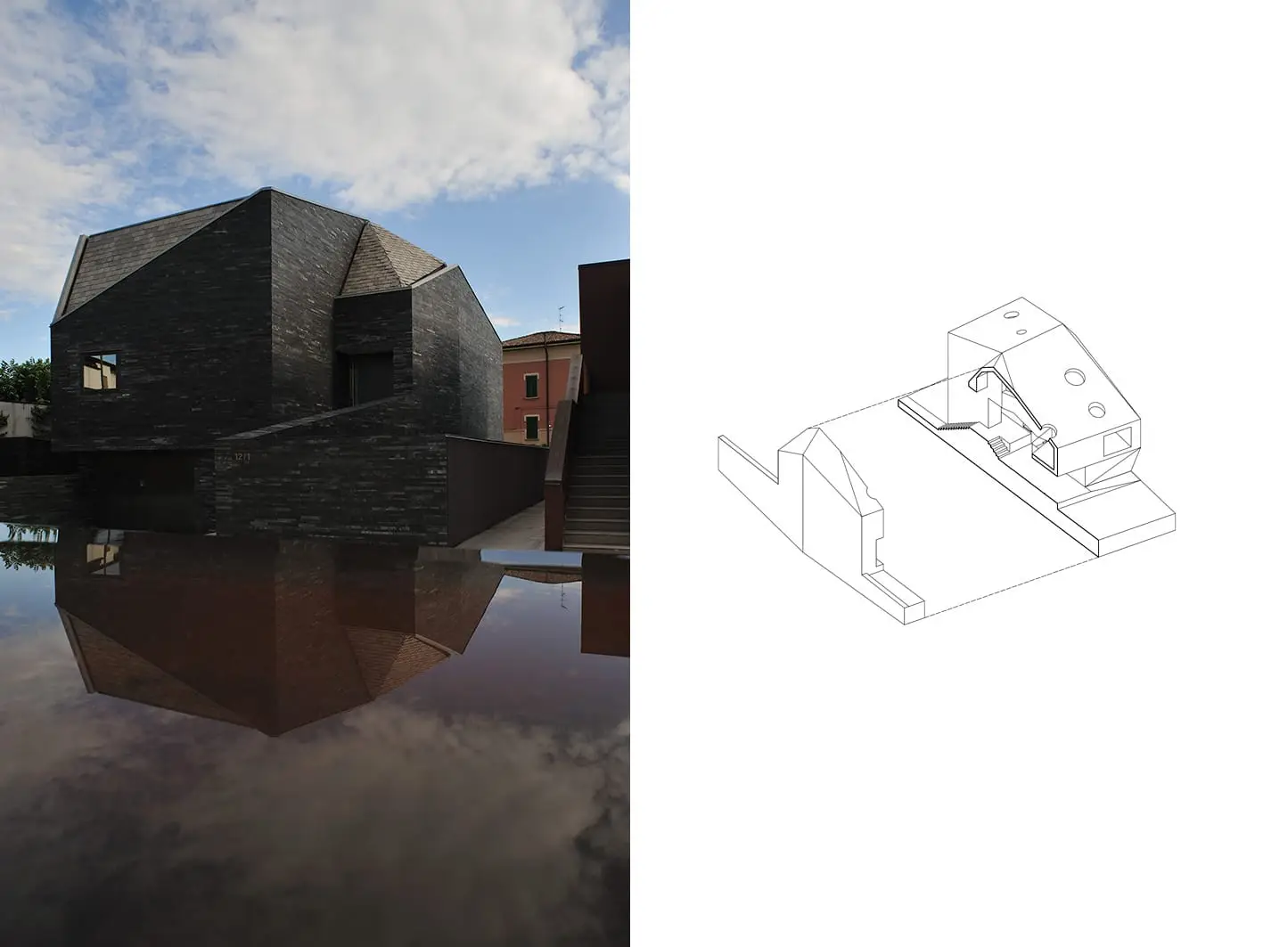 Il progetto realizza il desiderio del committente, Ruggero Fiorella, di abitare una struttura contemporanea, studiata per essere vissuta nella sua totalità, concepita sia in termini di tempo che di spazio. Di conseguenza la forma geometrica è metafora non solo del progetto architettonico ma anche della vita che si trasforma. L’architettura di questa abitazione è stata concepita come uno sviluppo di percorsi dove il movimento da una attività alla successiva diviene il principio germinale del progetto. Questo concetto si esprime creando una serie di rapporti tridimensionali che permettono di fruire gli ambienti come continuo susseguirsi di punti di vista. La casa, sorretta da una struttura portante tradizionale, si presenta come un involucro materico in pietra, materiale che prosegue anche in copertura, accompagnando il plasmarsi delle falde in relazione ai diversi lati del lotto. Le aperture sono rivolte soltanto verso i due lati che garantiscono intimità, a sud verso la campagna e ad ovest verso il muro di confine. Questo concetto permette di vivere il giardino come un ampliamento della zona giorno, in particolare nella zona a sud, dove un sistema di spazi pavimentati in ceramica raccordano le diverse quote del giardino esterno con la loggia che, senza soluzione di continuità, si relaziona con il soggiorno interno. Il doppio volume e il frammentarsi della scala divengono elementi fondamentali: essi uniscono gli ambienti posti su livelli diversi, spesso con poche alzate, “obbligando” il fruitore a vivere la quotidianità della casa in modo dinamico ed oltrepassando uno spazio per raggiungerne un altro spazio e un altro ancora.