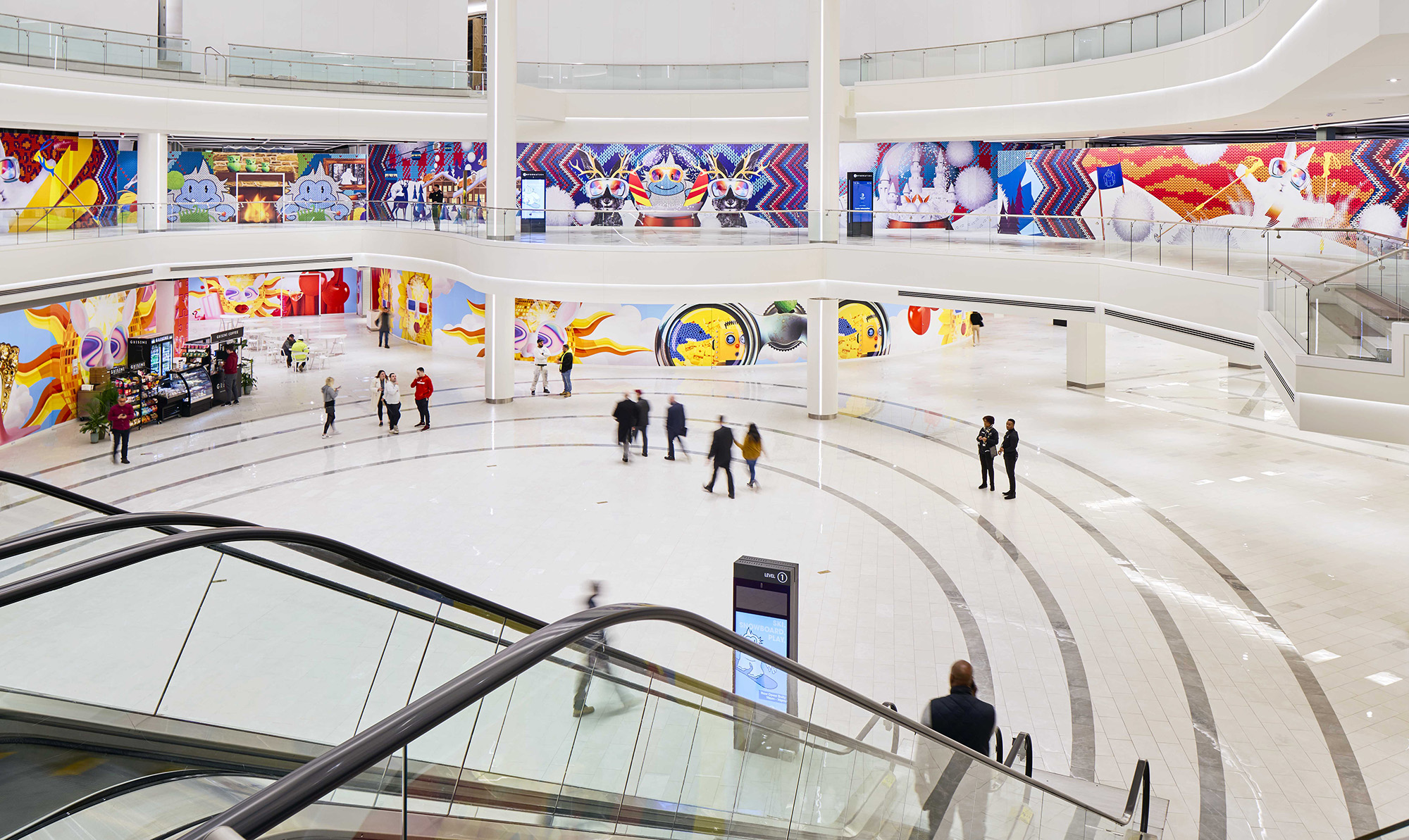 Located in the New York Metropolitan area, American Dream is a 3.2 million-square-foot property that combines shopping, entertainment, and family attractions under one roof. Within a sleek and texturally designed environment, more than 450 retailers and dining destinations are complemented by the ultimate leisure experiences including a water park, NHL-sized ice rink, and 300-foot-tall Observation Wheel. The plethora of patterns and colors that characterized the building from its original construction in the early 2000’s have been transformed by GH+A design studios into a cohesive palette of chic, white tone-on-tone finishes with black framing details. This was accomplished with elegant, marble-inspired porcelain tile from Atlas Concorde, which was used as flooring throughout the “Main Street” common corridors as well as for some of the walls, columns and accent pieces. The firm also specified gauged porcelain panels from Lea’s Slimtech Absolute line for the columns and white glossy tiles from Imola’s Recolour collection for the restroom walls.