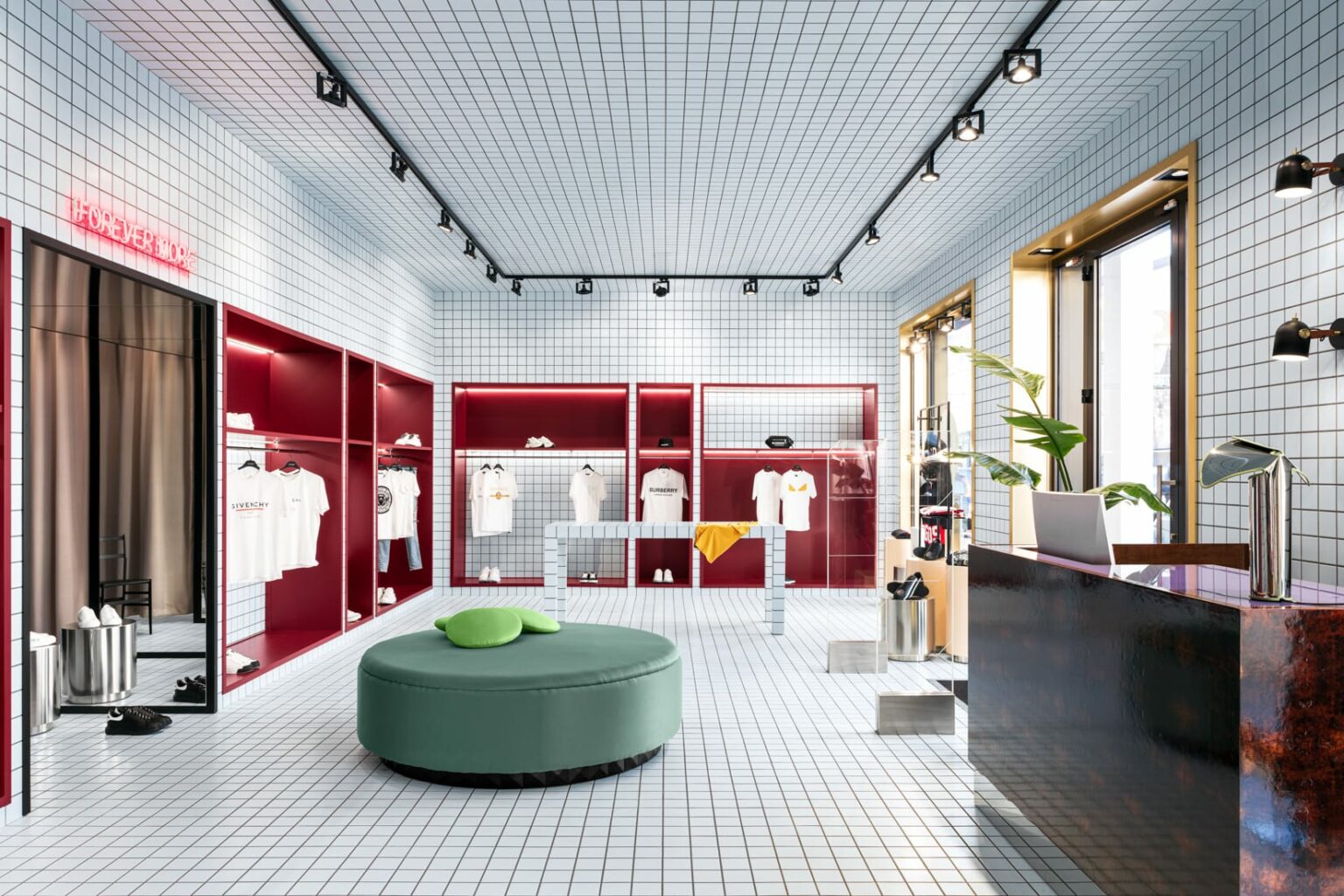 Il progettista inventa uno spazio che è un vero e proprio laboratorio che ci riporta agli anni Settanta. La presenza di oggetti “iconici”, come le sedute Superleggera di Gio Ponti e Chiara di Mario Bellini, si integra perfettamente con la funzione commerciale di questa boutique di abbigliamento. Il tutto realizzato con circa ventimila piastrelle 10×10 cm. che rivestono pareti, pavimento e anche soffitto. Un manifesto culturale e produttivo nel segno del Made in Italy.