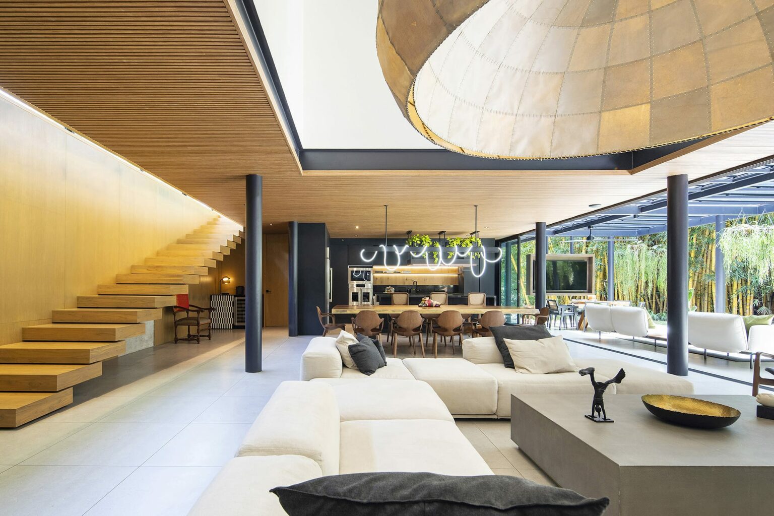Casa V is a modern and sustainable single-family residence in San Jose, Costa Rica designed by Taller KEN to give the owners ample space to relax and unwind. Set into a hillside that opens up to a tropical bamboo surround, the home’s interiors are arranged to focus on the tranquil views toward the rear of the property. Furniture with neutral tones and a refined material palette of Italian porcelain and teak wood help tie the home to the plot of land and create the feeling of bringing the outdoors inside. The firm used light gray porcelain flooring from Italgraniti throughout the house for its large format and durability while tiles from the brand’s Ceppo di Gre collection were chosen for the bathroom to achieve the look of polished terrazzo without the installation challenges.
