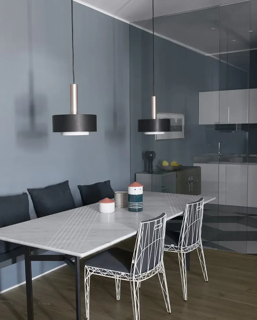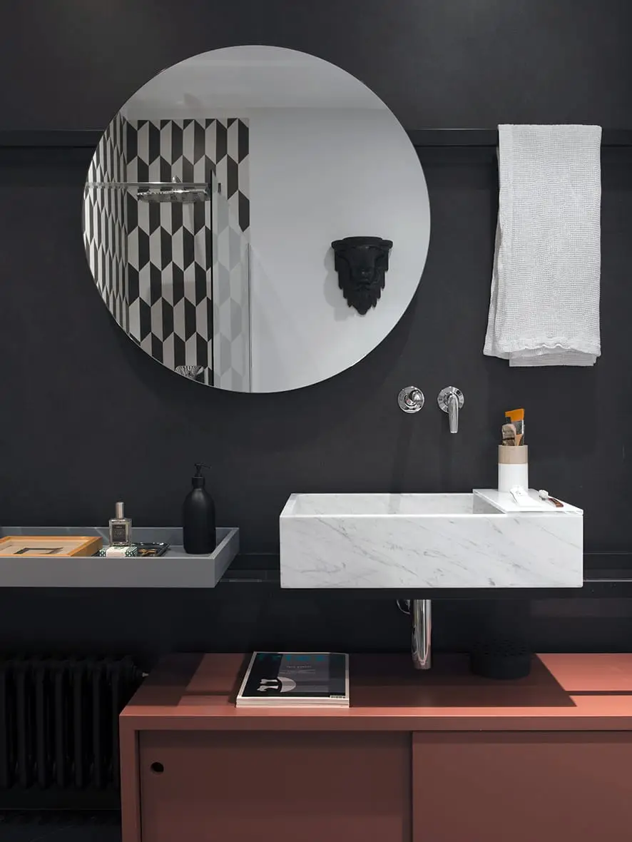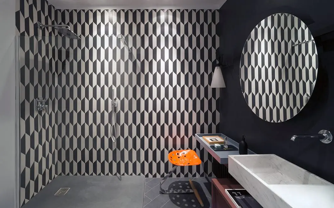 In particolare, l’utilizzo di un modello escheriano nella cucina e nel bagno, ridefinisce lo spazio, con un effetto di “straniamento”, nuovo ma comunque in sintonia con il resto del progetto.