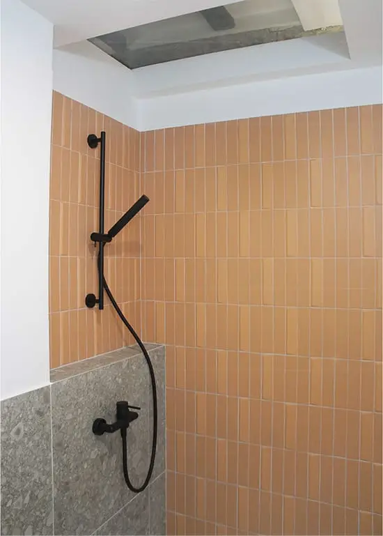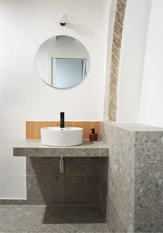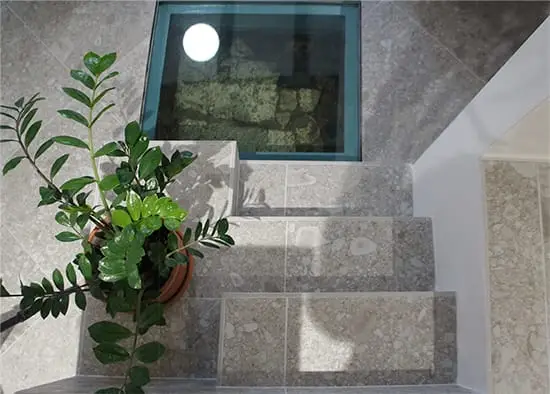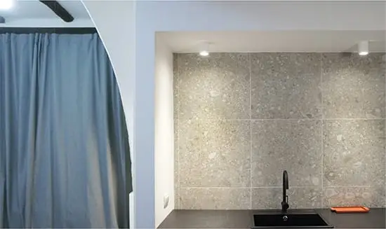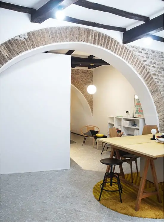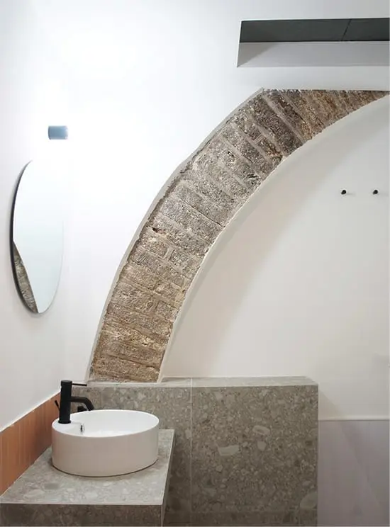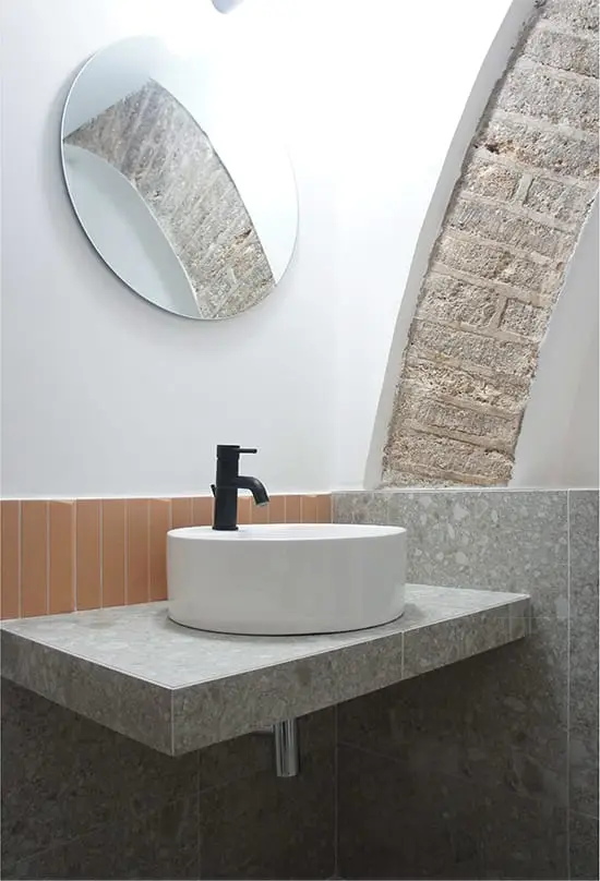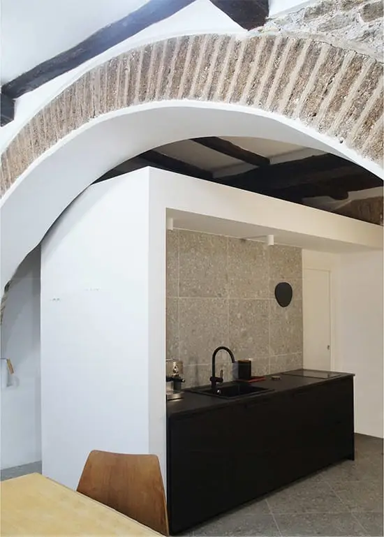 Un piccolo studio che si sviluppa attraverso altezze importanti, all’interno di un contesto storico. La ceramica ridisegna tutte le superfici orizzontali e alcune pareti verticali, svelando la capacità di essere materiale non solo di rivestimento, ma elemento compositivo insostituibile quando è necessario intervenire in modo unitario, senza però sposare una logica di omologazione linguistica.