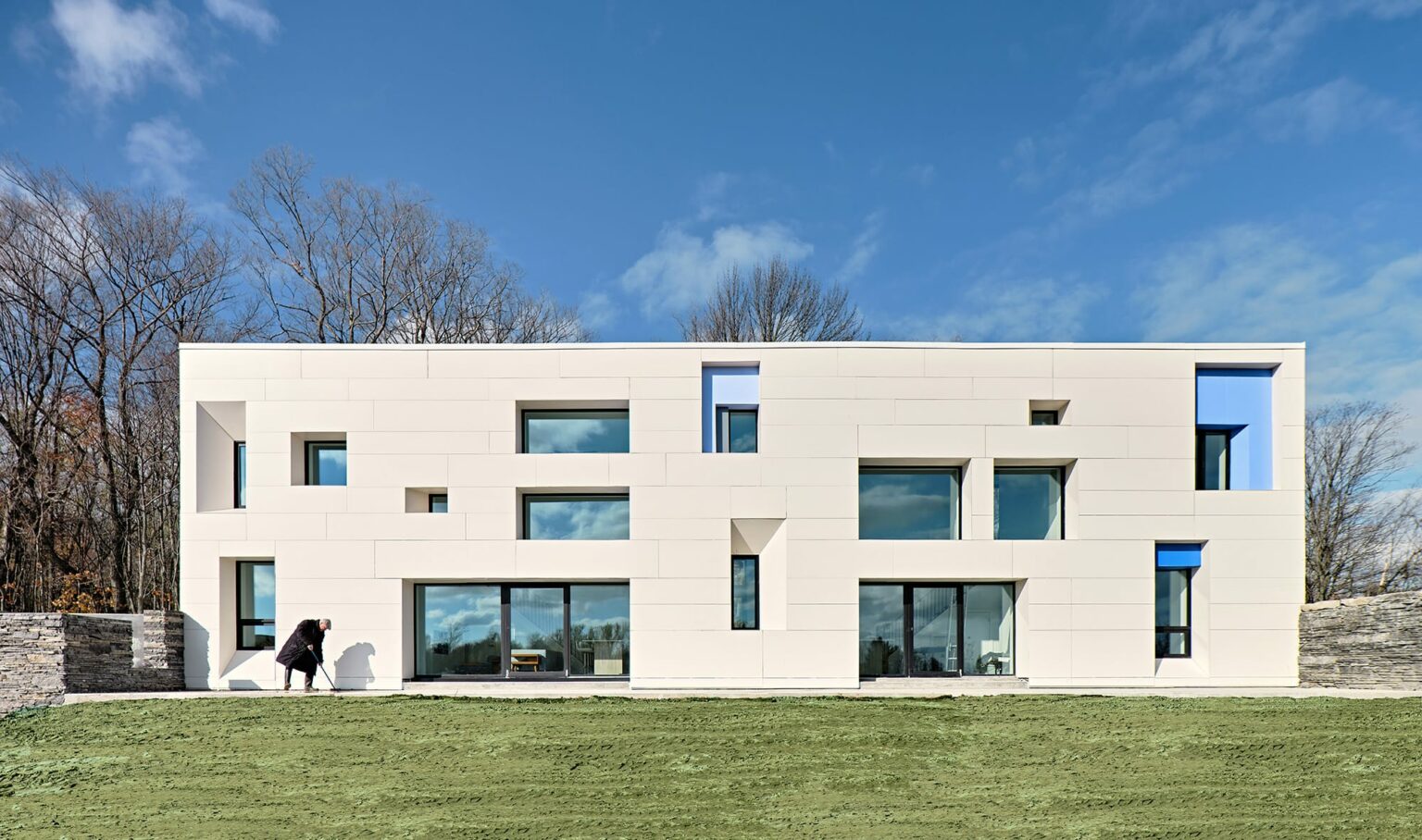 Set in the bucolic landscape of Prince Edward County in Ontario, the Endymion Guesthouse is a three-level, multi-generational single-family house designed for the owners’ visiting family, friends and guests. It luxuriates in the landscape, the environment, and the climate of the locale, offering a quiet bower for besotted guests. Designed by Kearns Mancini Architects Inc. using the latest Passive House practices, the guesthouse offers its residents a healthy, energy-efficient and cost-saving way of living. Porcelain tile from Laminam’s Neve collection in a 3.5mm thickness offered the lightest, strongest and most beautiful cladding option, allowing the firm to create a ventilated rainscreen wall while avoiding any thermal bridging.