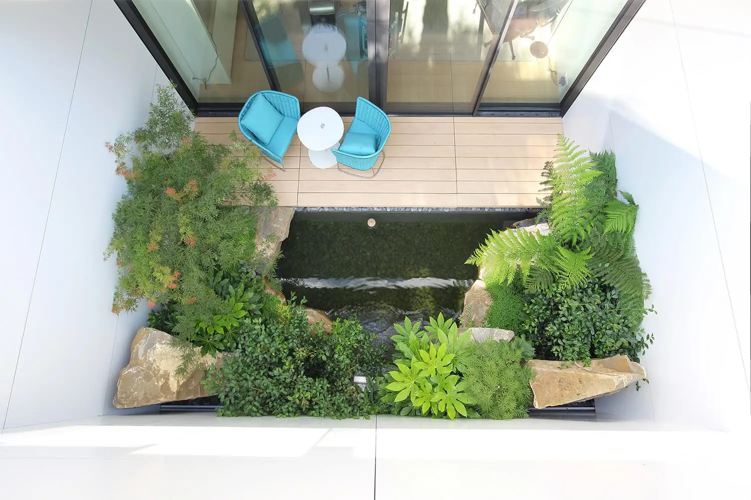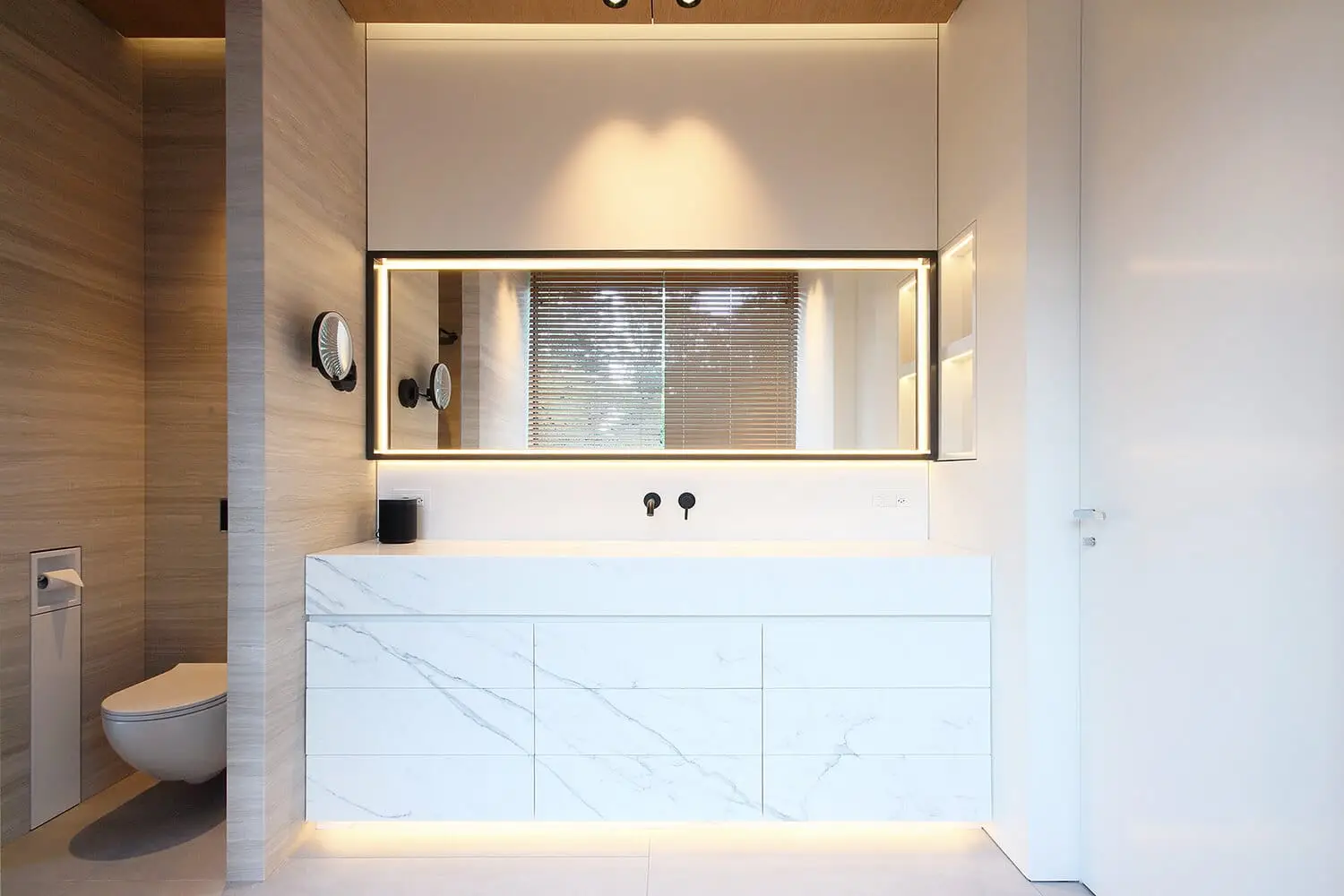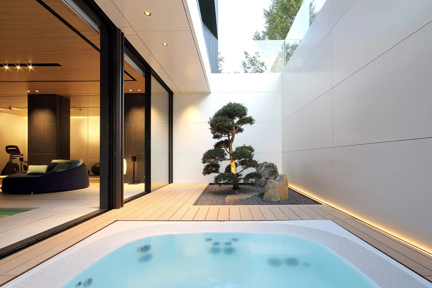 Progetto di grande dimensione, una articolazione di spazi e di connessioni, destinato a una residenza famigliare. Accanto a una serie di materiali di grande efficienza costruttiva, è molto diffusa la ceramica, dalla facciata ventilata al pavimento della piscina, dal pavimento dei bagni a quello del garage fino a locali strettamente di carattere tecnico. Un particolare utilizzo di materiale ceramico italiano che costituisce una scelta produttiva, ma anche una sorta di imprinting estetico del nostro paese.