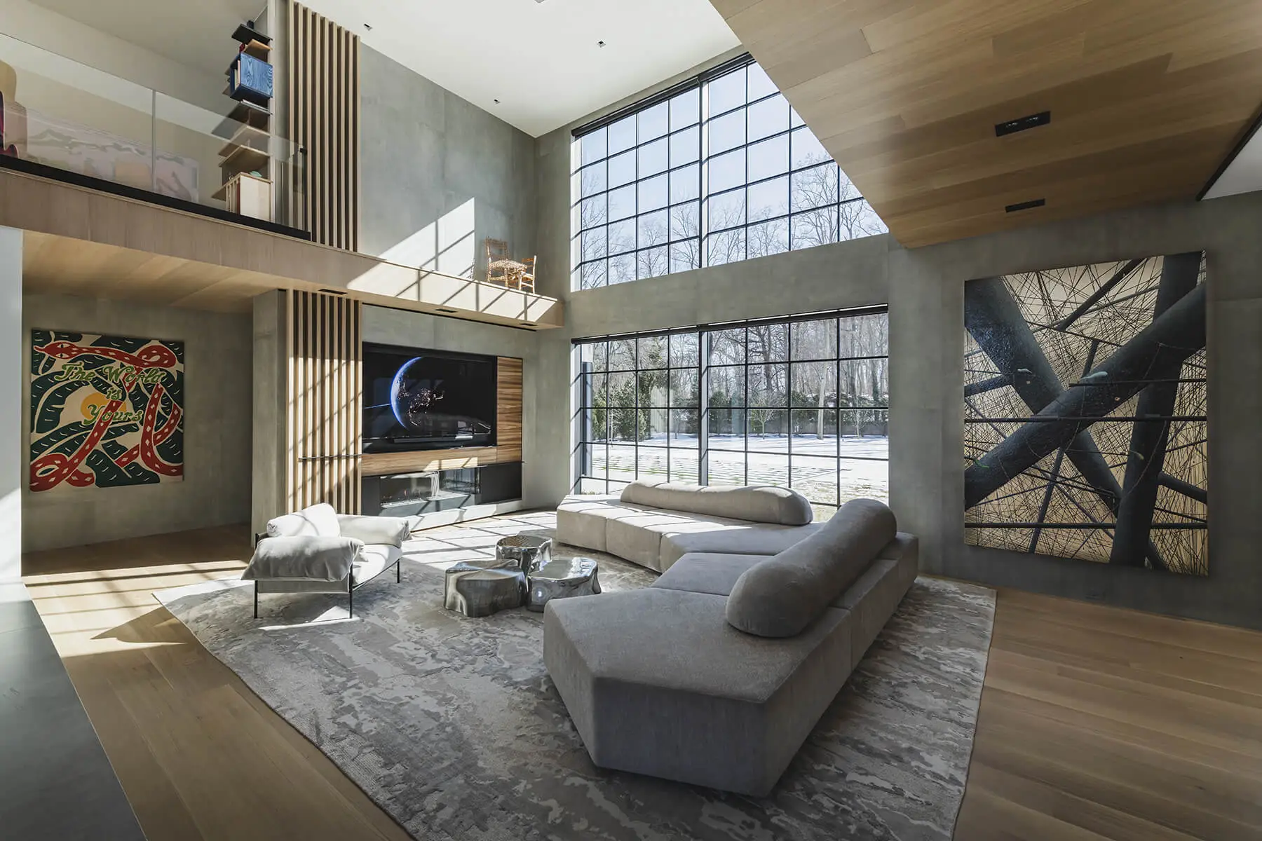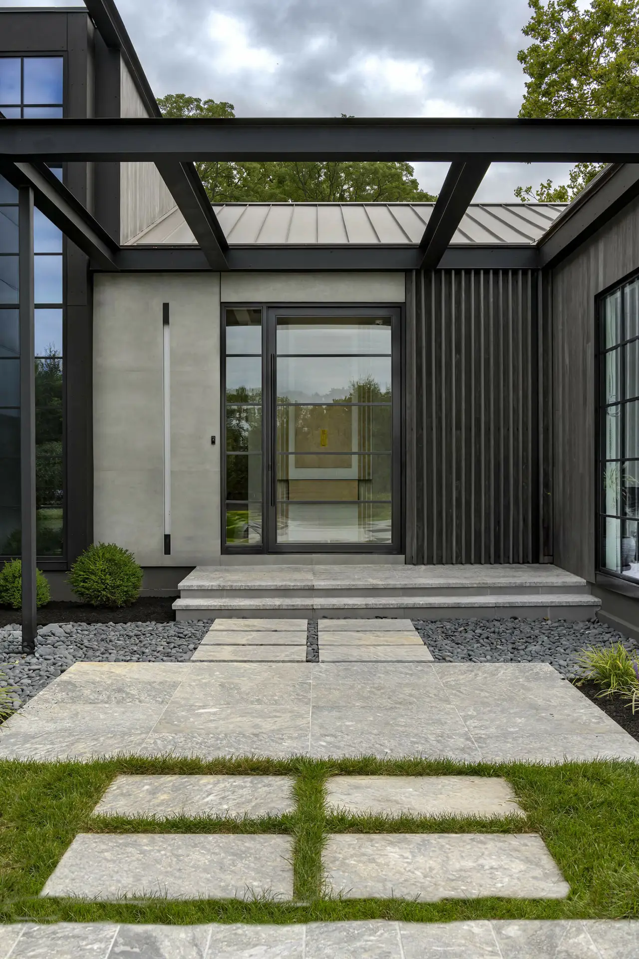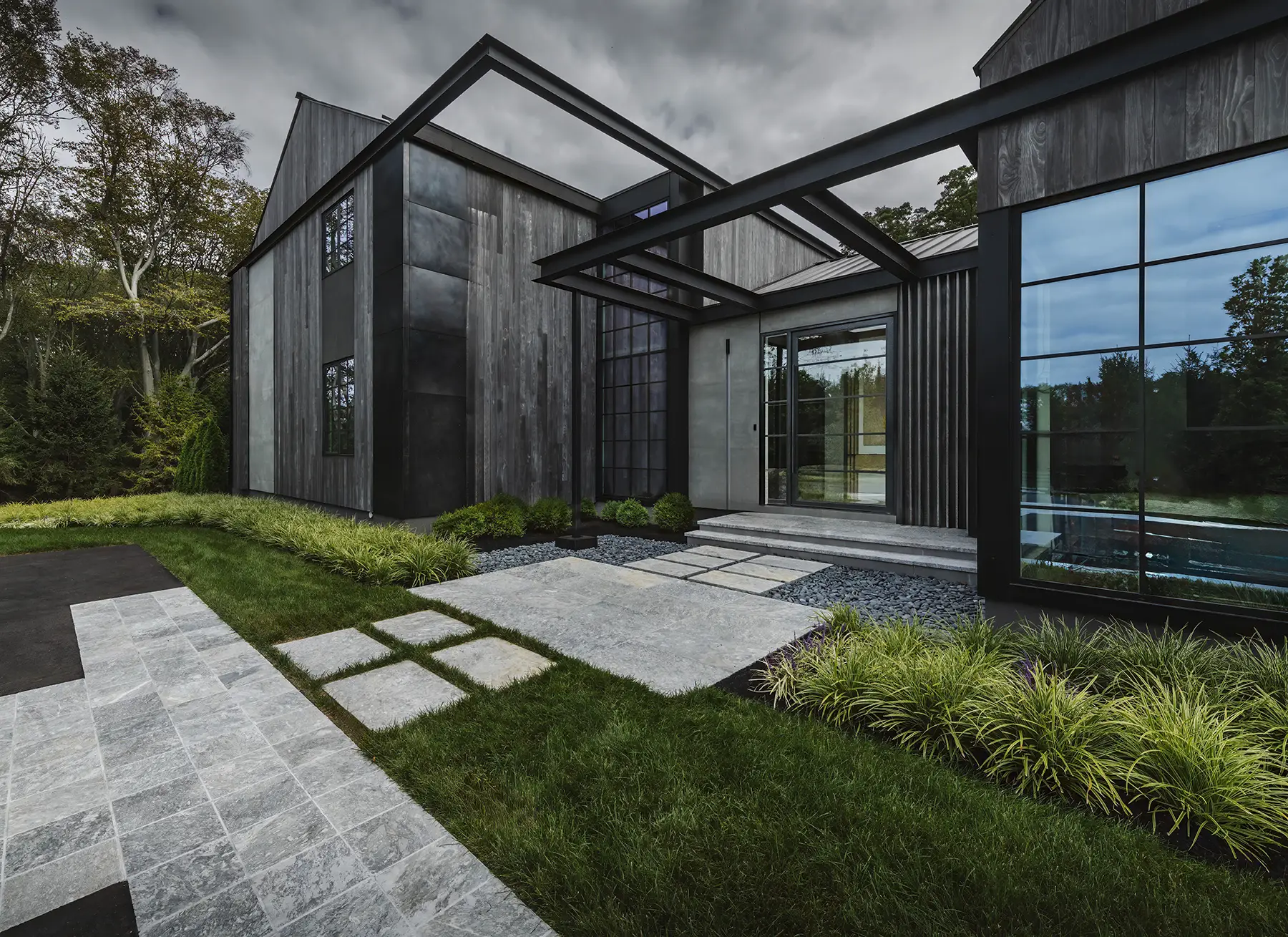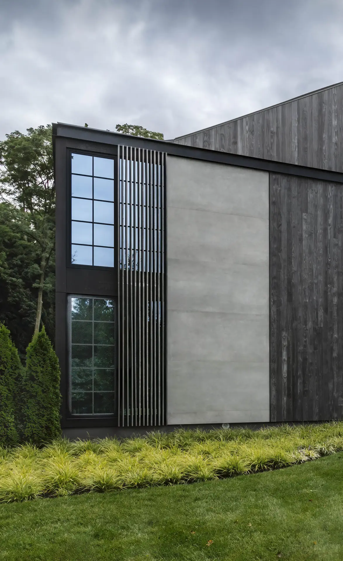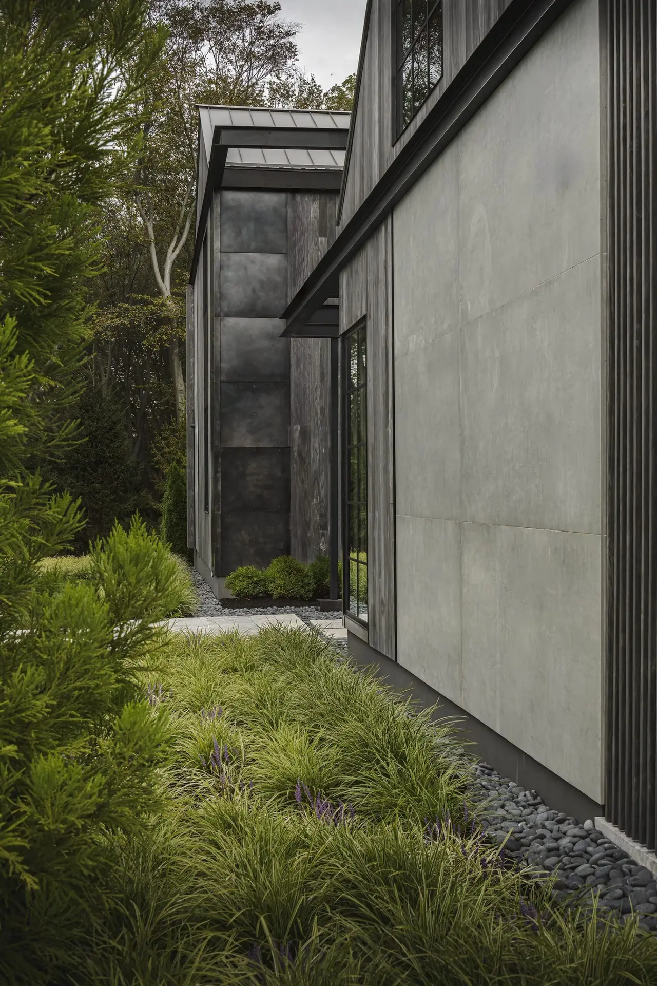 Set within the lush landscape of Old Westbury, New York, Hidden Pond House reinterprets the classic barn structure through a modernist lens. Designed by Mojo Stumer Associates, the home balances raw materials – featuring washed grey wood, concrete, and exposed steel – with refined architectural elements. A defining material throughout the home is the Matrice series by CEDIT, a large-format porcelain tile used on both the exterior and interiors. On the facade and rear elevation, the tile contrasts against dark wood slats, creating a striking rhythm, as bold, triangular roofs and distinctive windows invite light and frame the surrounding greenery. Inside, CEDIT’s Matrice tiles appear on a dramatic double-height entry wall, accent walls in the halls and stairways, and above the fireplace, where its ability to reflect light and enhance spatial depth powerfully draws the eye upward. The tile’s consistent presence – including moments in bedroom entries and alongside the owners’ art collection – unifies the interior palette while strengthening the home’s seamless relationship with the outdoors.