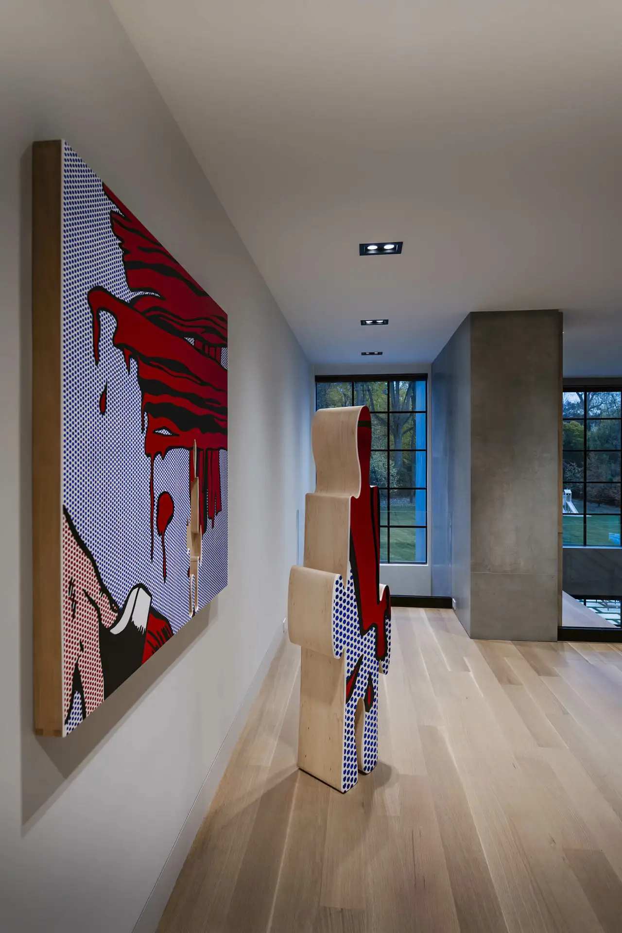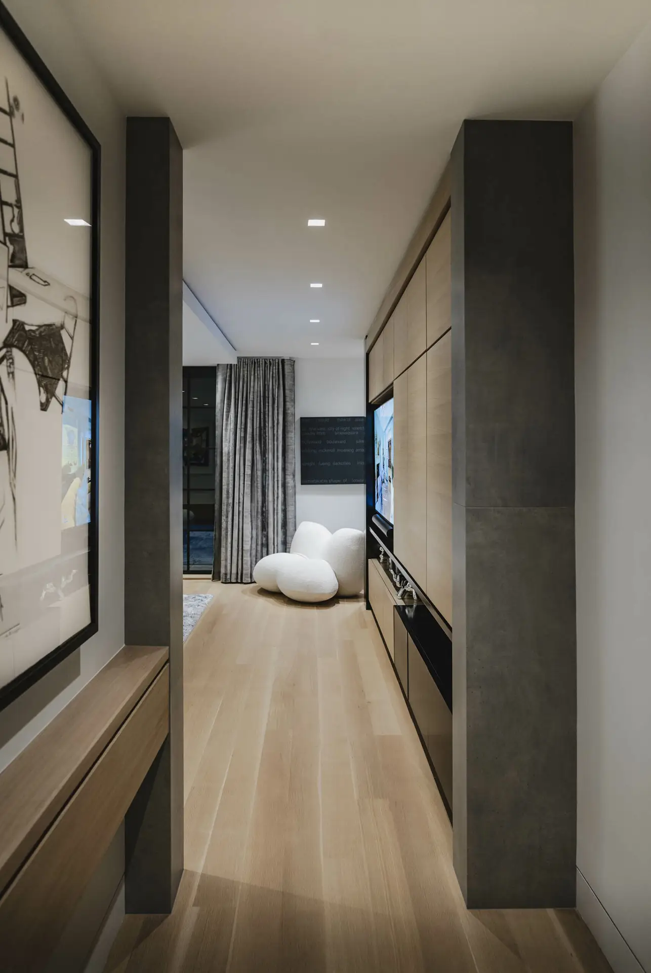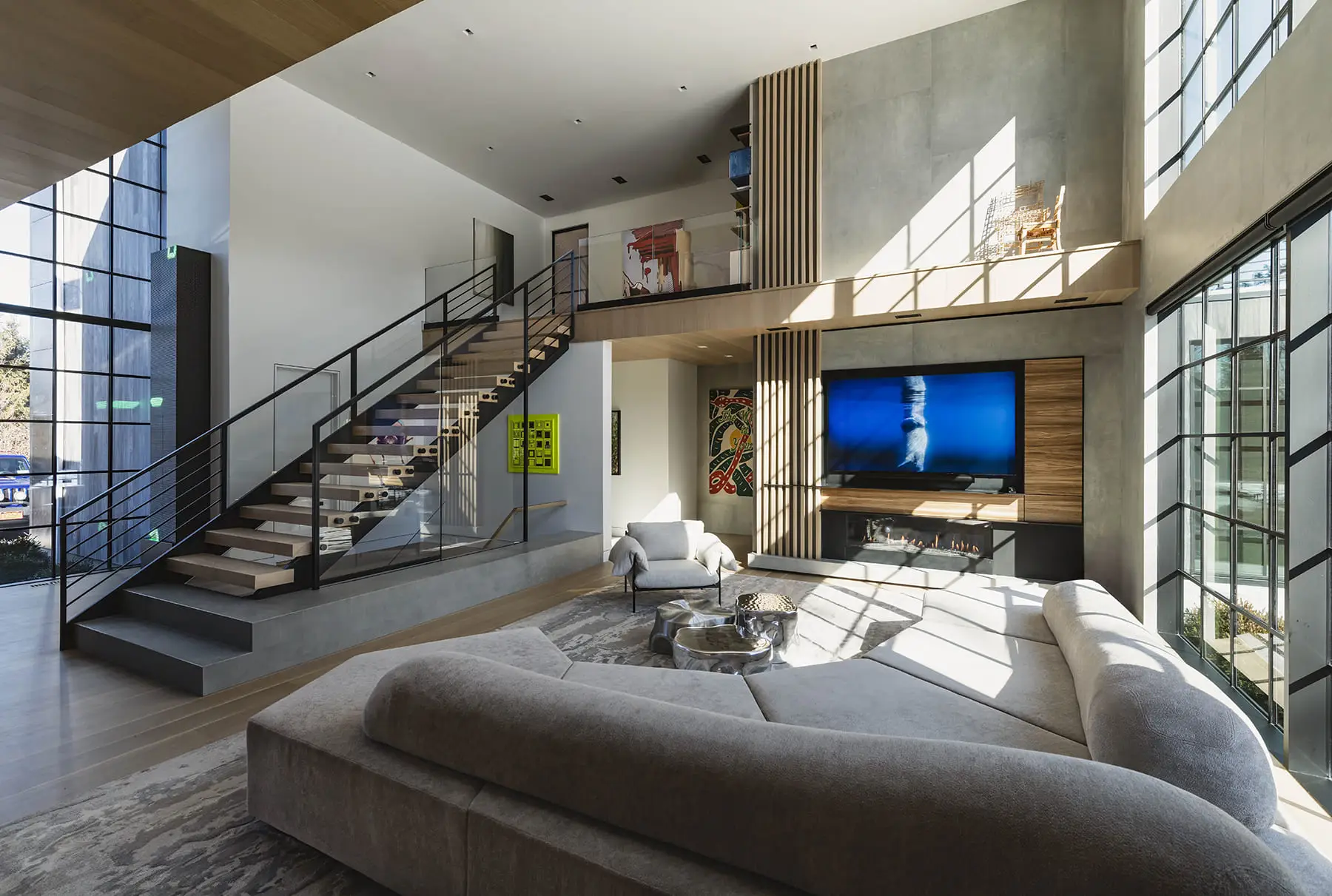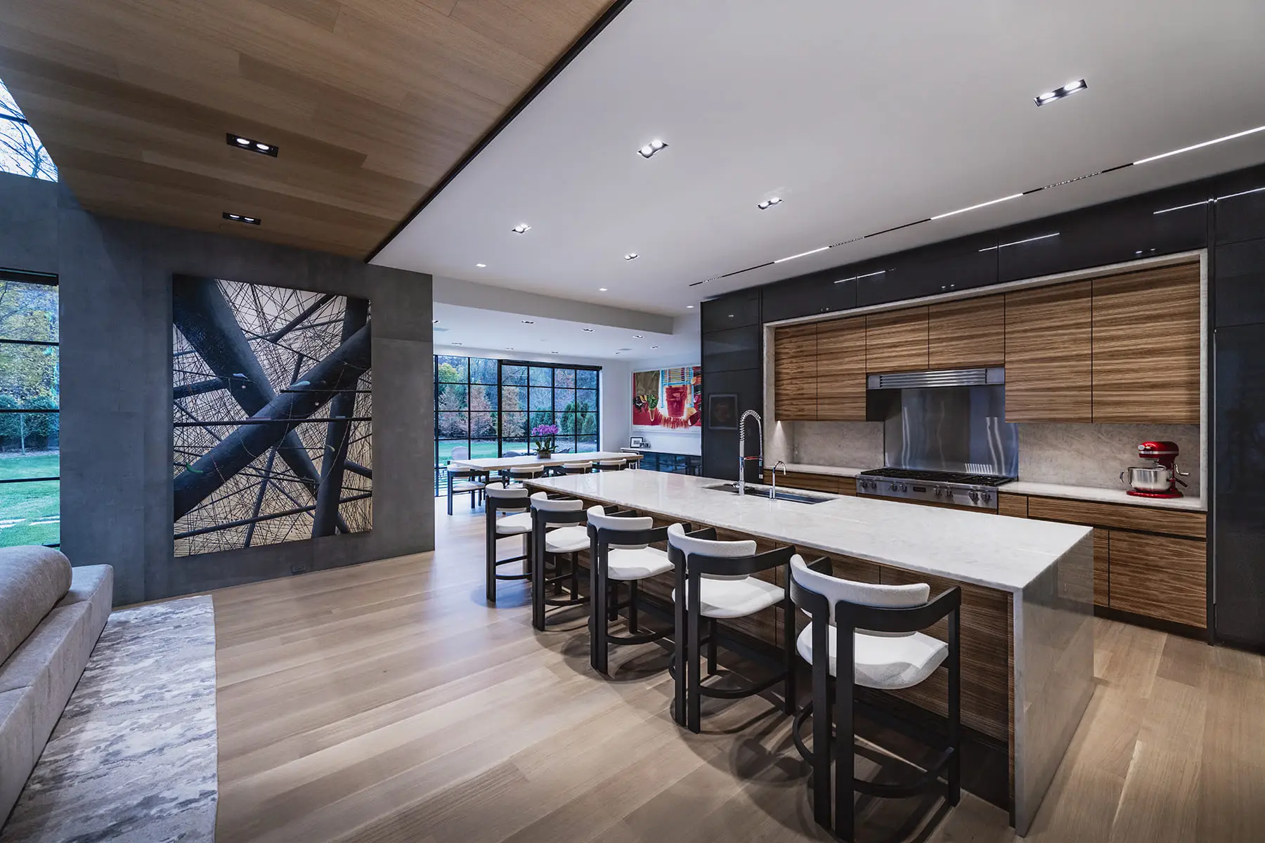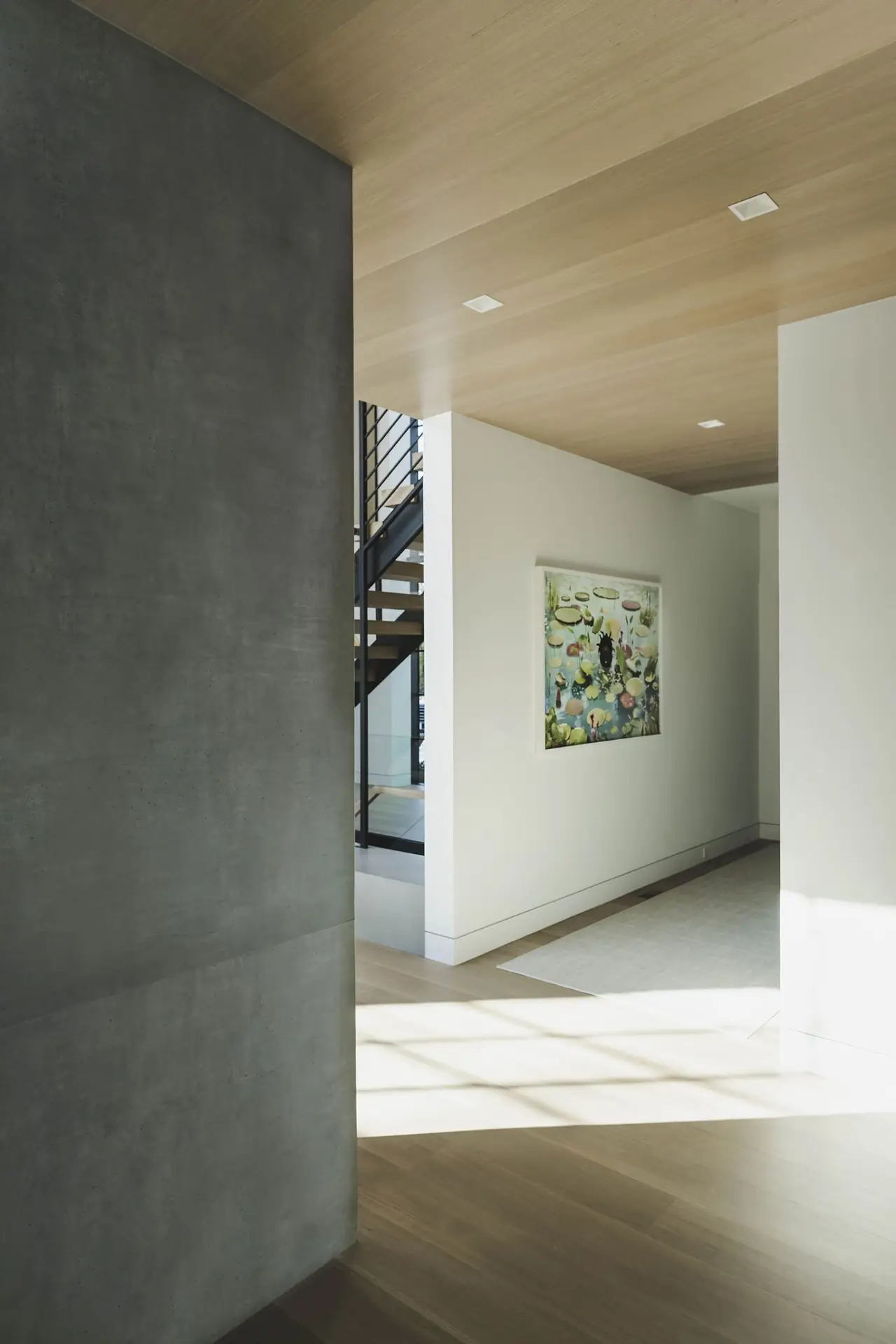 Set within the lush landscape of Old Westbury, New York, Hidden Pond House reinterprets the classic barn structure through a modernist lens. Designed by Mojo Stumer Associates, the home balances raw materials – featuring washed grey wood, concrete, and exposed steel – with refined architectural elements. A defining material throughout the home is the Matrice series by CEDIT, a large-format porcelain tile used on both the exterior and interiors. On the facade and rear elevation, the tile contrasts against dark wood slats, creating a striking rhythm, as bold, triangular roofs and distinctive windows invite light and frame the surrounding greenery. Inside, CEDIT’s Matrice tiles appear on a dramatic double-height entry wall, accent walls in the halls and stairways, and above the fireplace, where its ability to reflect light and enhance spatial depth powerfully draws the eye upward. The tile’s consistent presence – including moments in bedroom entries and alongside the owners’ art collection – unifies the interior palette while strengthening the home’s seamless relationship with the outdoors.