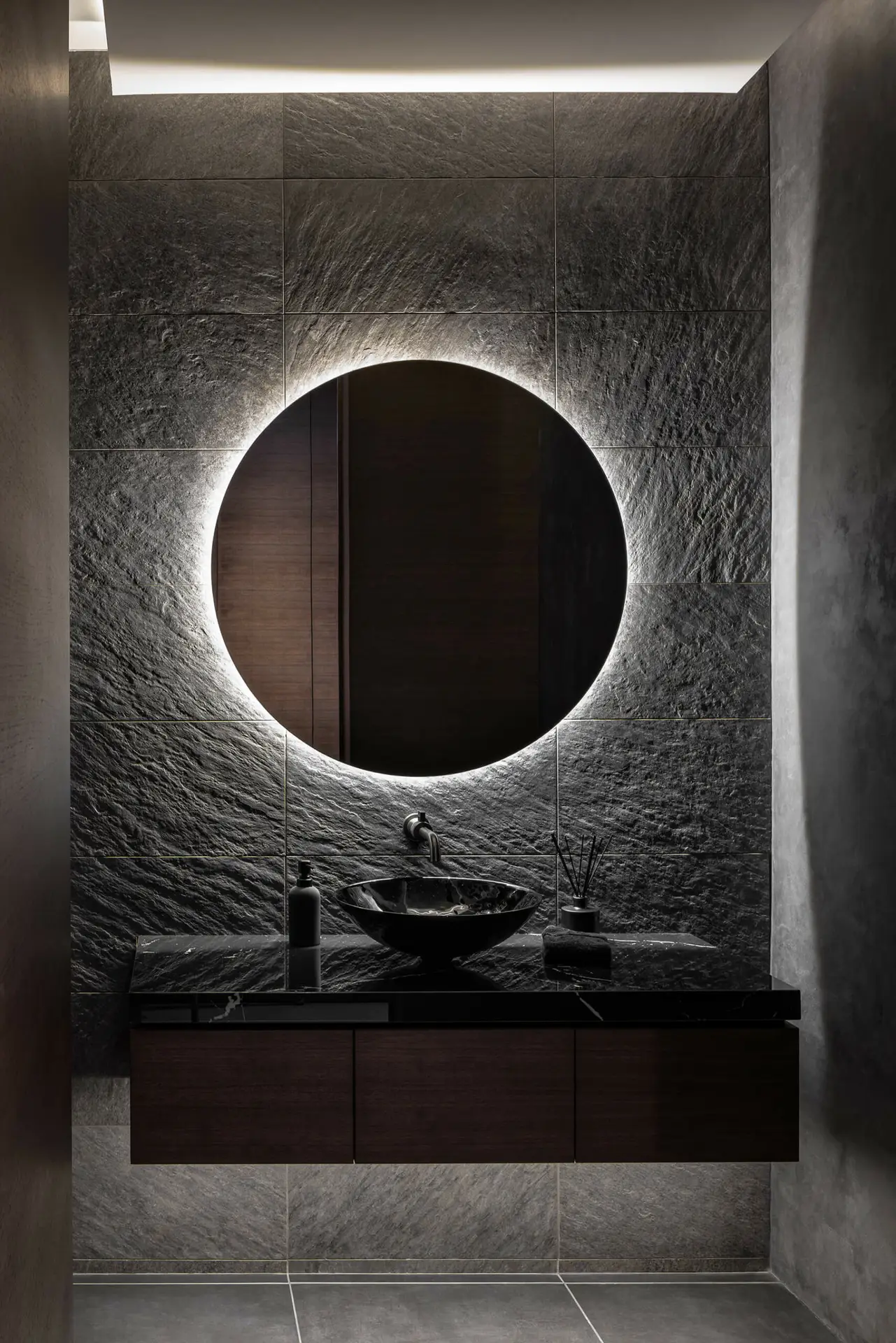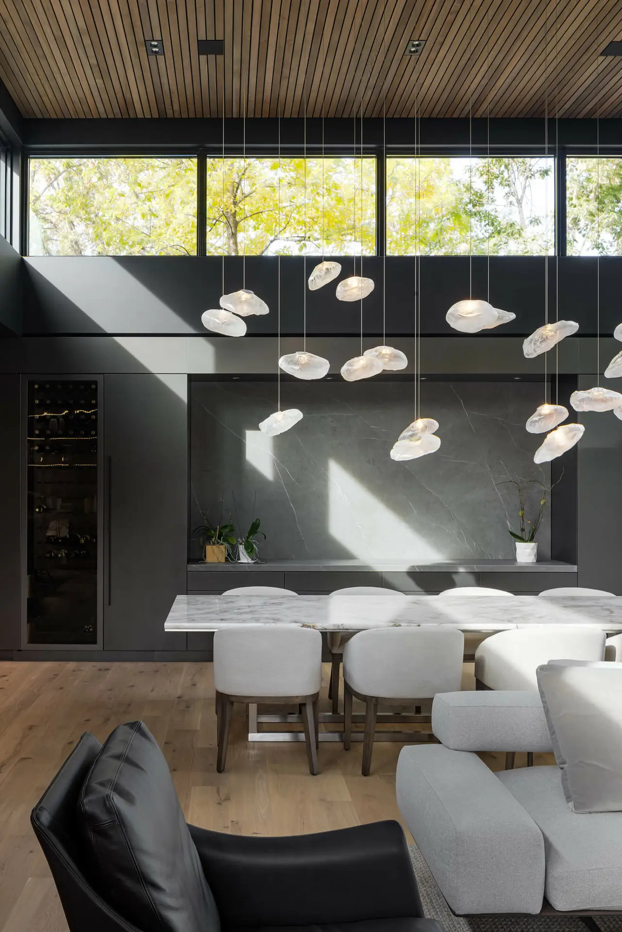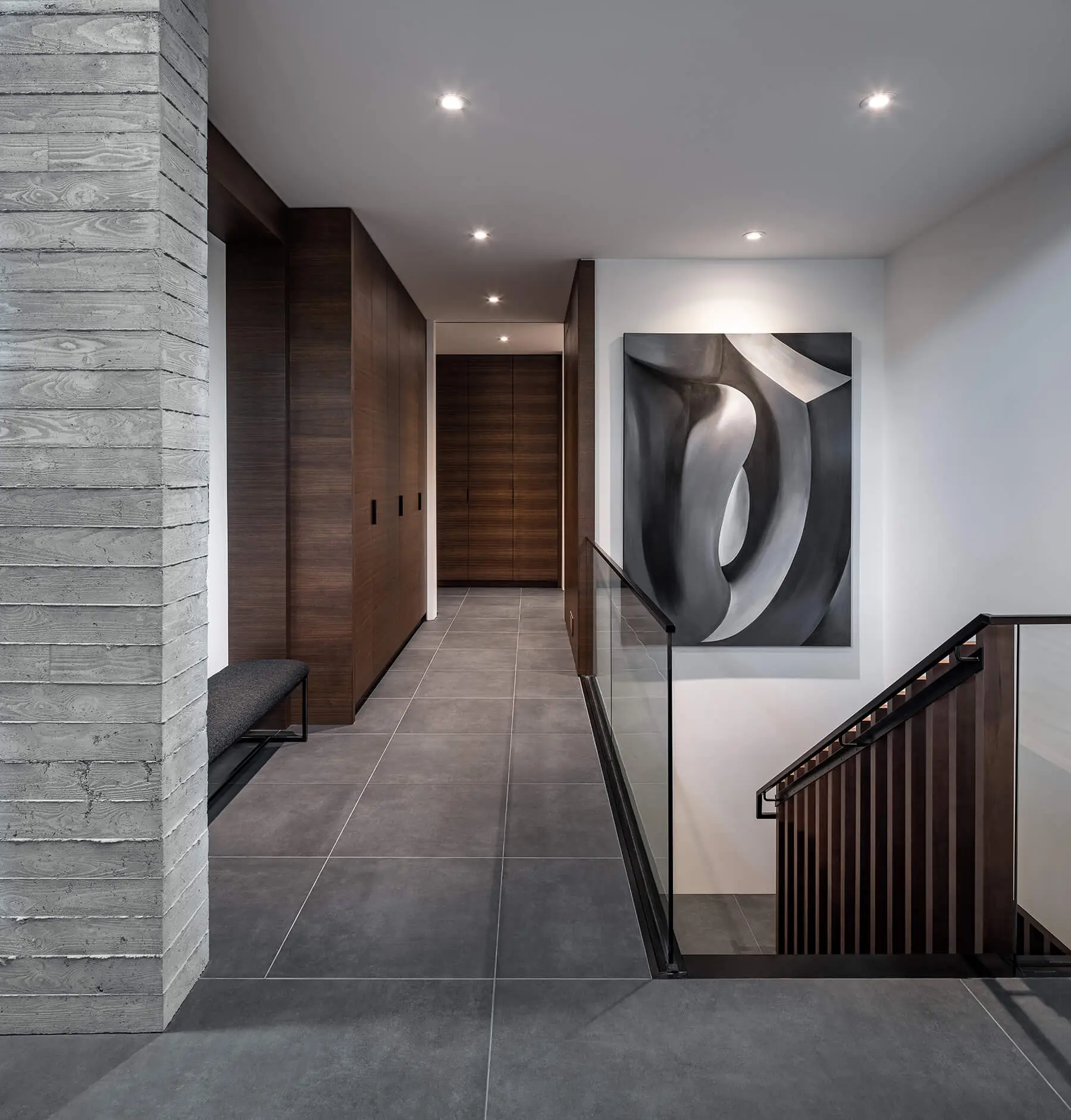 Nestled along the Assiniboine River, Living Lounge is a hotel-inspired bungalow that blurs the line between indoor comfort and outdoor entertaining spaces. Designed by Canada-based firm Secter Architecture + Design, the residence centers on a sprawling open-plan living, dining, bar and lounge space, oriented to capture optimal light during evening gatherings. The interior flows effortlessly into exterior entertainment zones, including a sauna and an alfresco kitchen with serene river views. As a unifying element throughout the home, Mirage’s Glocal collection lends a clean, contemporary surface to the main entrance, laundry, and powder room floors, while the brand’s textured Quartziti line adds depth to the powder room walls. In the kitchen and dining areas, Laminam’s Pietra Grey porcelain surfaces wrap the backsplash, buffet, island face, and countertops, creating a refined, cohesive visual thread throughout the home.