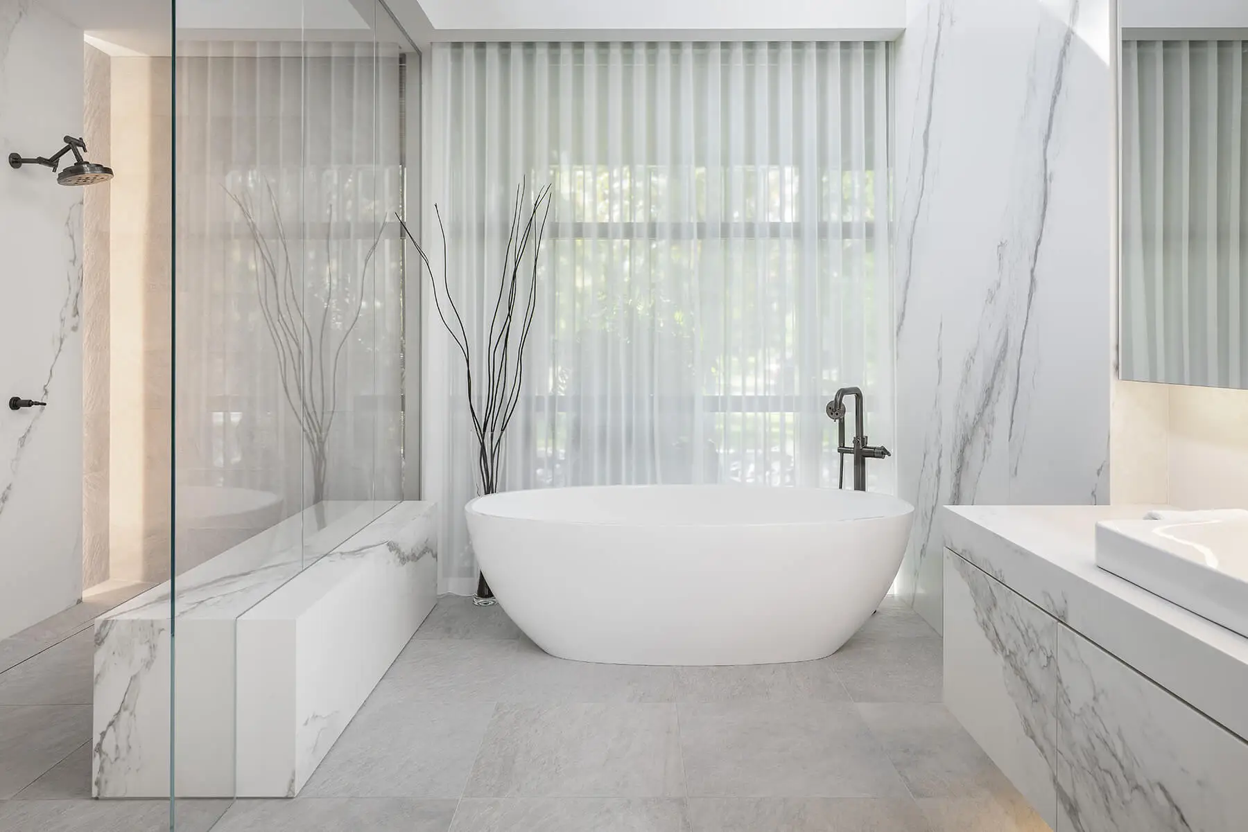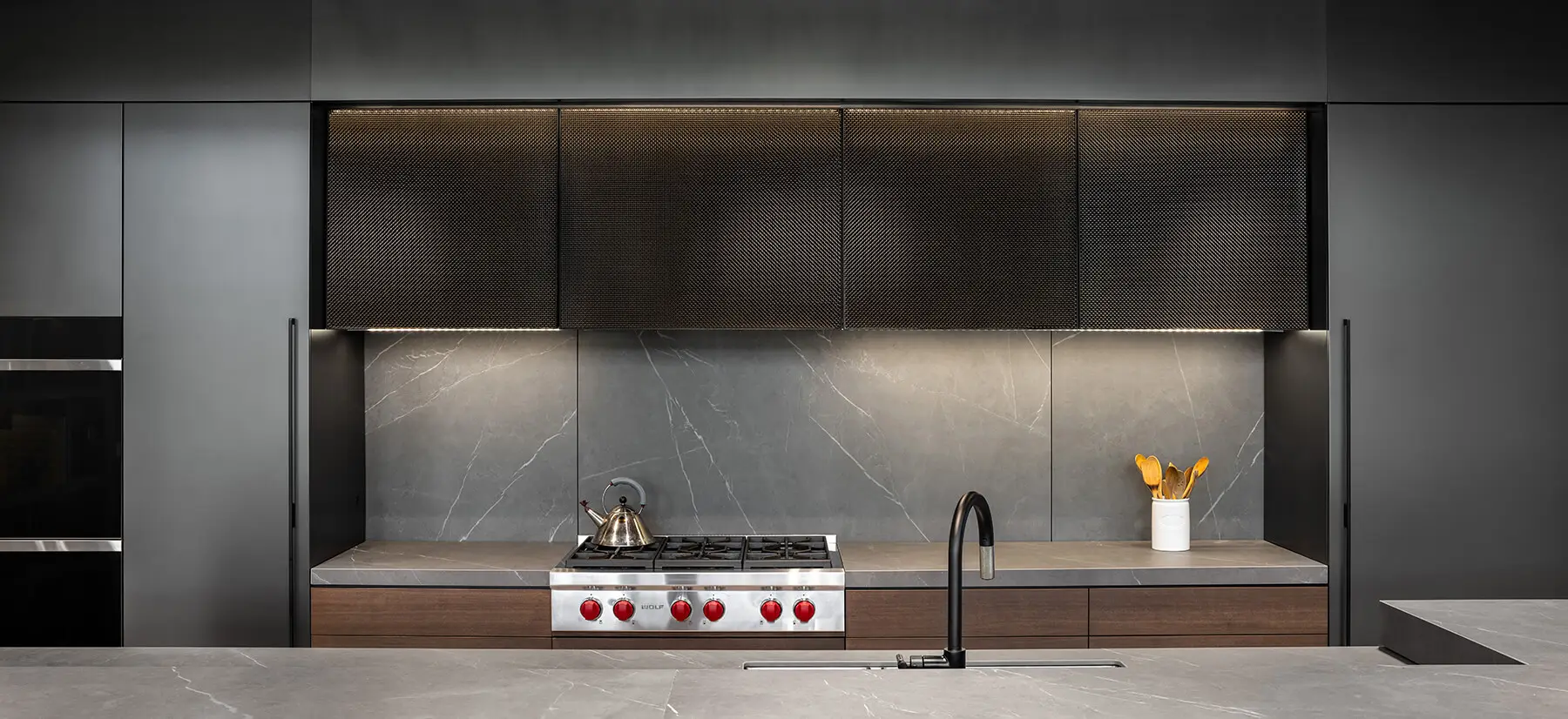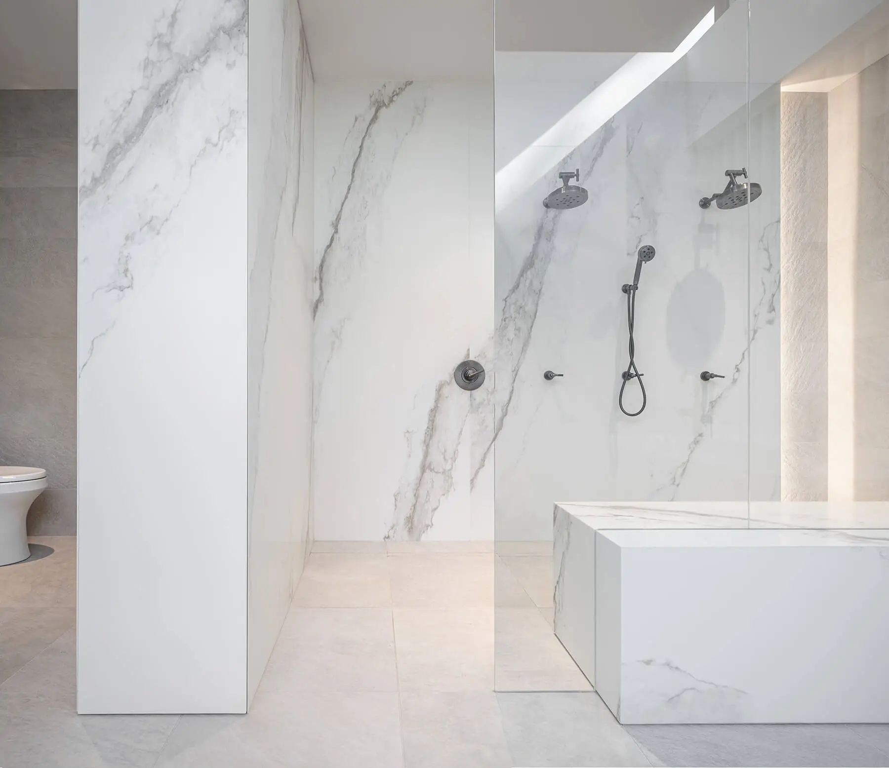 Nestled along the Assiniboine River, Living Lounge is a hotel-inspired bungalow that blurs the line between indoor comfort and outdoor entertaining spaces. Designed by Canada-based firm Secter Architecture + Design, the residence centers on a sprawling open-plan living, dining, bar and lounge space, oriented to capture optimal light during evening gatherings. The interior flows effortlessly into exterior entertainment zones, including a sauna and an alfresco kitchen with serene river views. As a unifying element throughout the home, Mirage’s Glocal collection lends a clean, contemporary surface to the main entrance, laundry, and powder room floors, while the brand’s textured Quartziti line adds depth to the powder room walls. In the kitchen and dining areas, Laminam’s Pietra Grey porcelain surfaces wrap the backsplash, buffet, island face, and countertops, creating a refined, cohesive visual thread throughout the home.