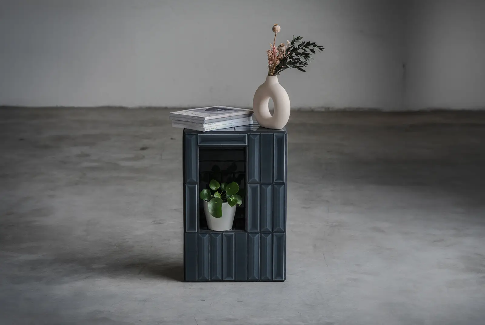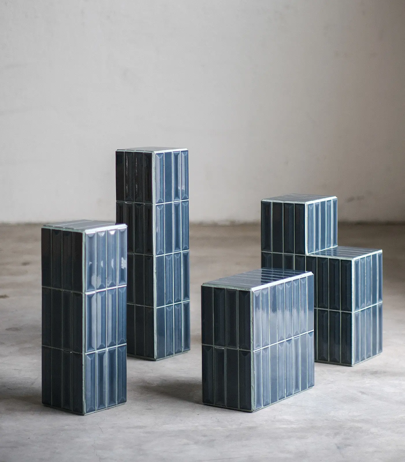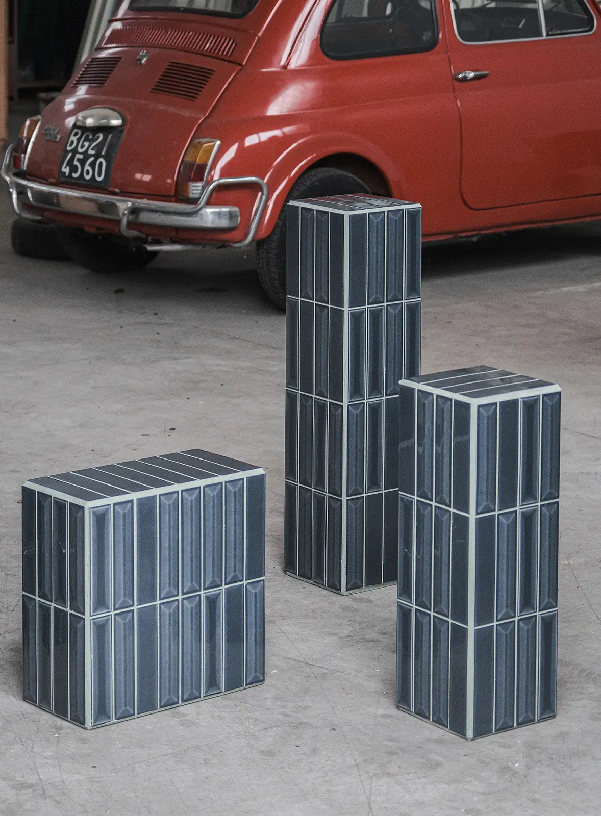 Metropolitan Waves is an imaginative series of four elements designed on the basis of the modularity of three-dimensional blue tiles. These four elements can rotate and integrate freely, allowing the creation of compositions adaptable to any environment, perhaps even to street furniture. The name of the project draws inspiration from the changing skyline of metropolitan cities and these small skyscrapers can be used as pedestals, free-standing tables or parts of more complex compositions. Special attention is paid to the colour of the joints, in chromatic harmony with the objects themselves. This reuse initiative also promotes an ethical and conscious approach to design.