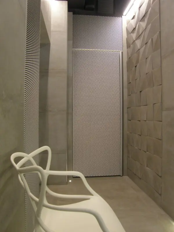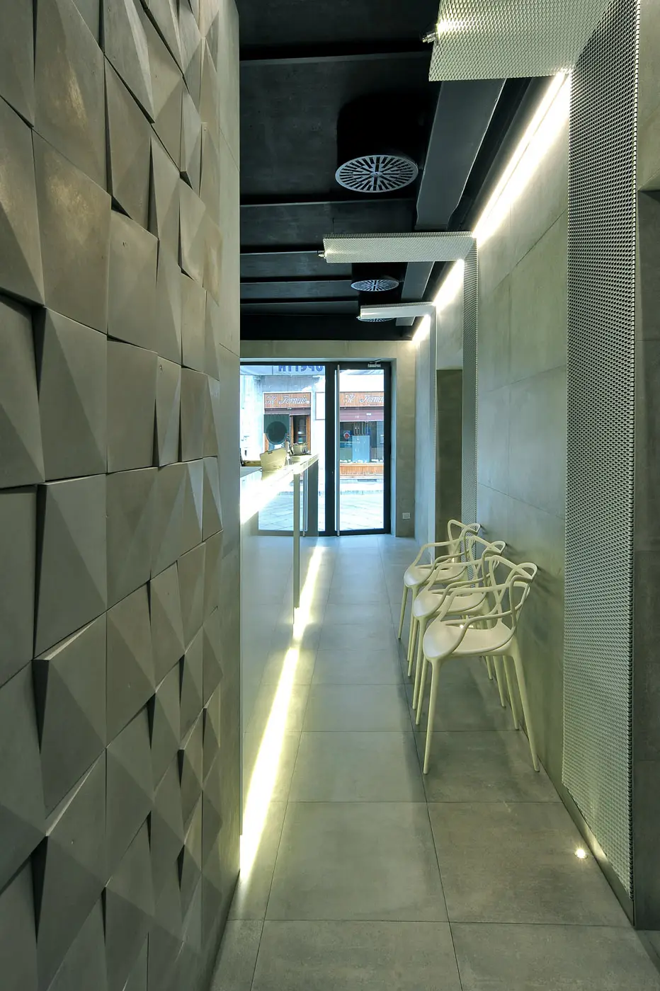 Il concept alla base del progetto è stato quello di proporre un’immagine insolita e nuova per una pizzeria. Solitamente legata a stereotipi vernacolari e kitsch. Il progetto ha voluto rompere questa tradizione (negativa) proponendo una visione più contemporanea e suggestiva. La pizzeria “Pupetta” è uno storico riferimento nella città, costituita da due angusti locali, lunghi e stretti (3 x 10 mt. ca.) illuminati su un solo lato da due vetrine che si affacciano sul corso principale di Vercelli. La soluzione adottata dal progetto è stata quella di operare per sottrazione. I due locali sono stati trasformati in puro spazio dallo stereometrico lirismo accentuato da un elemento progettuale costante e caratterizzante: la luce. L’illuminazione è infatti realizzata con strisce luminose a led che accentuano le forme volumetriche primarie. Il minimalismo generale è esaltato dall’uso del rivestimento utilizzato su tutte le superfici del locale. Sono state scelte delle lastre in gres ceramico di grande formato (120 x 60 cm.) ad imitazione del cemento grezzo, alternate per contrasto a piastrelle decorative tridimensionali in cemento naturale. La sezione superiore è buia e opaca, definita spazialmente da pannelli in lamiera stirata in alluminio naturale che in maniera discontinua, assieme alle condotte per l’aerazione lasciate in vista, compongono e caratterizzano il soffitto. Tutto l’arredo mobile è di colore bianco (sedie Master di Kartell disegnate da Philippe Starck e tavoli Pedrali) per spezzare e lavorare di contrasto con gli ambienti monocromatici. Completa l’intervento l’immagine grafica coordinata che si esplicita della vetrina principale con un gioco di lettering in omaggio all’opera dell’artista concettuale Joseph Kosuth.