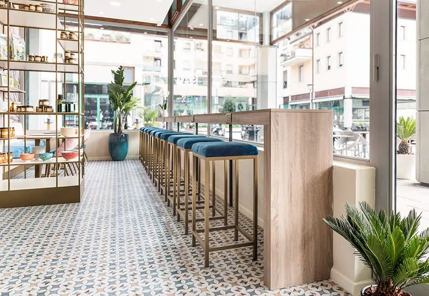 Il progetto interpreta in modo nuovo e originale sia l’organizzazione degli spazi, sia la cultura dell’interior design, individuando, nella scelta della pavimentazione e dei rivestimenti, un linguaggio compositivo di forte impatto decorativo come una sorta di intervento apparentemente artigianale ma, al contrario, riconducibile alla grande tradizione industriale della ceramica italiana.