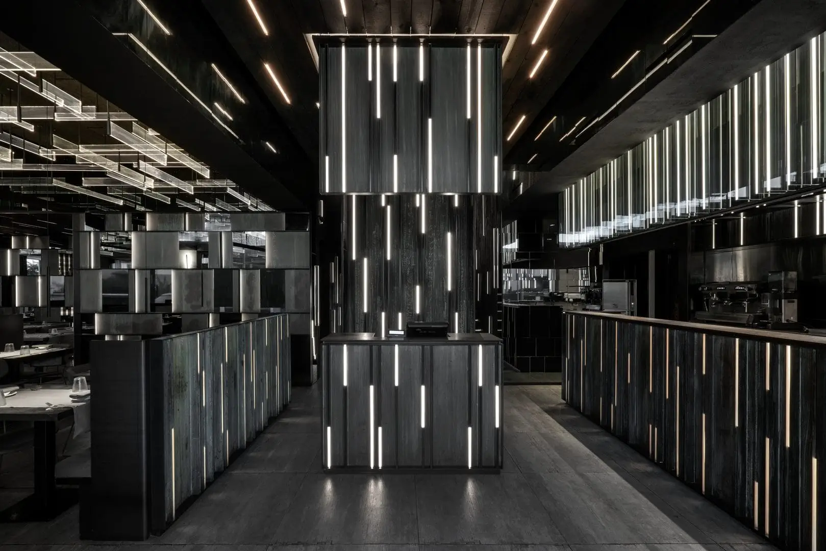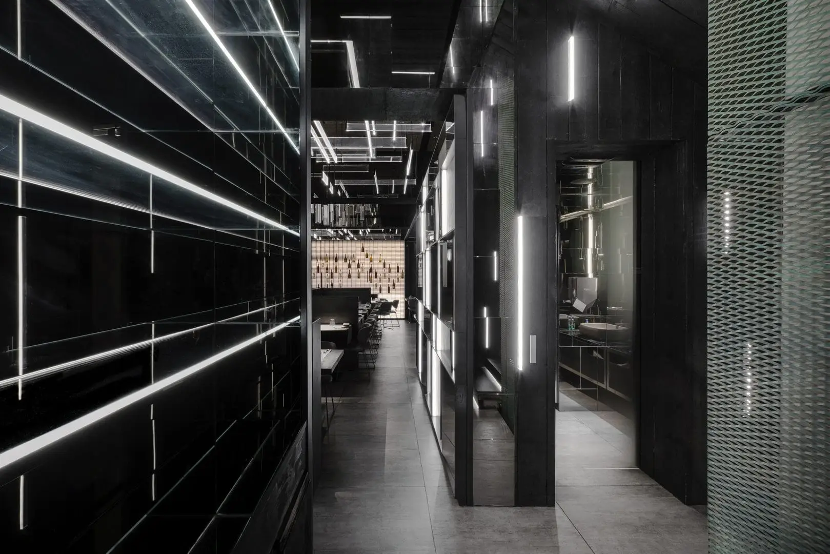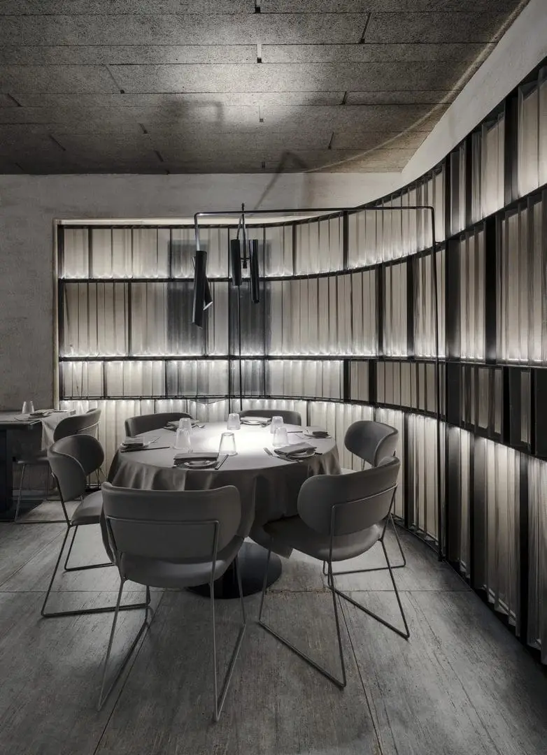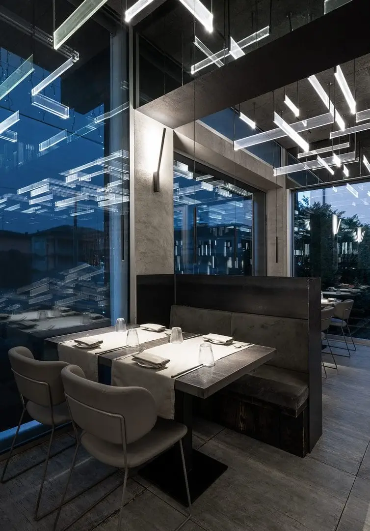 È uno spazio su due piani, capace di produrre un effetto di profondità reale, al centro del quale un’installazione luminosa si estende per la quasi totale altezza del locale, realizzando così una sorta di elemento di congiunzione e di orientamento. Alla ceramica viene affidato un ruolo centrale, sul piano compositivo, non solo per l’efficacia delle prestazioni, ma soprattutto per la presenza di un maxi-formato, dove l’effetto legno risponde in modo coerente alla luminosità diffusa. Il lavoro dimostra un grande controllo nella distribuzione degli spazi, senza mai perdere di vista la regia generale di un ambiente teatrale e funzionale.