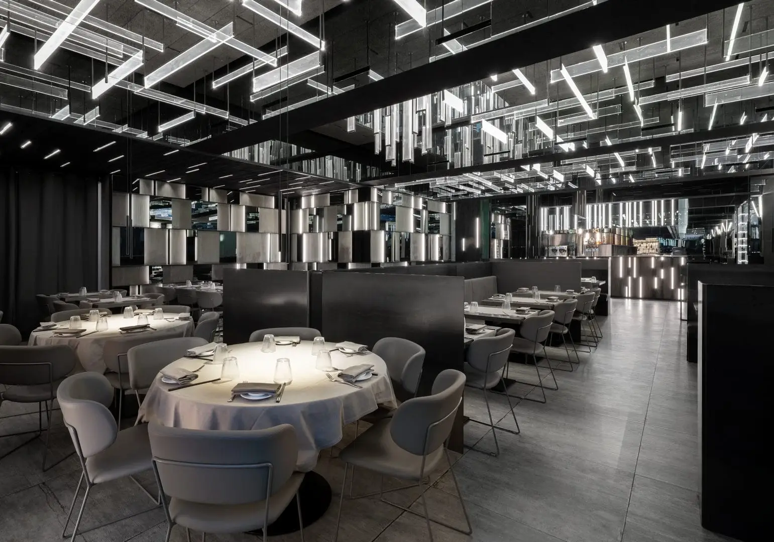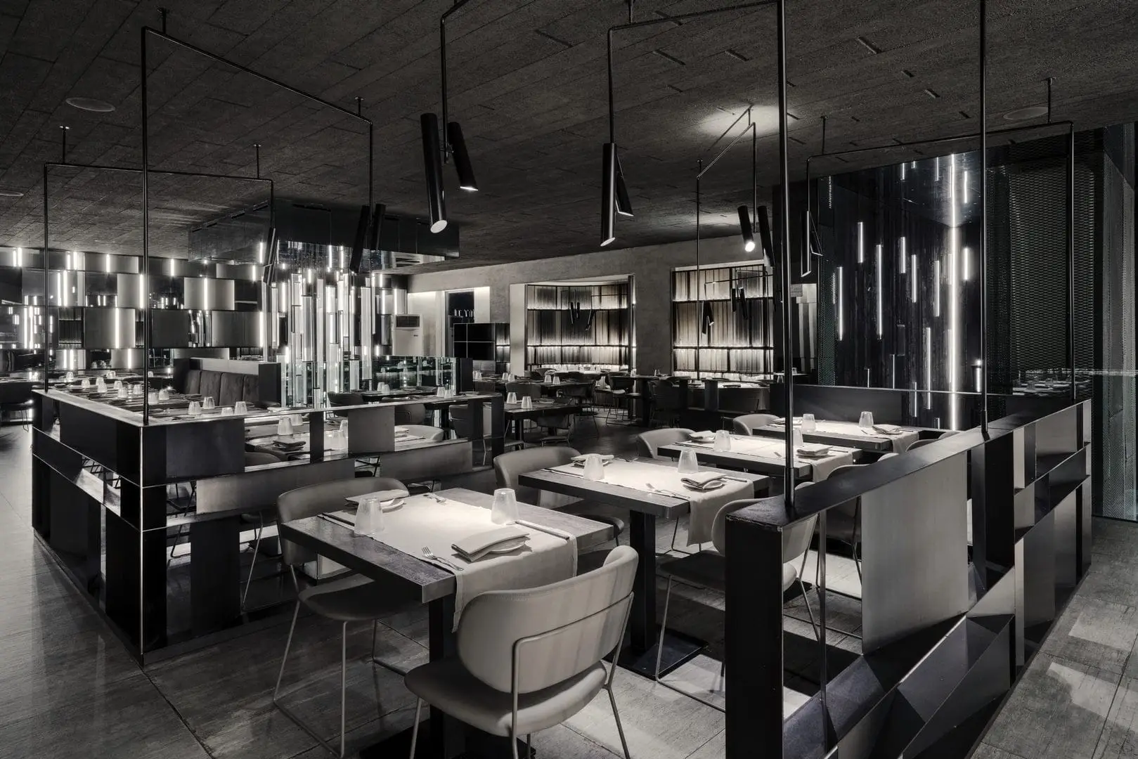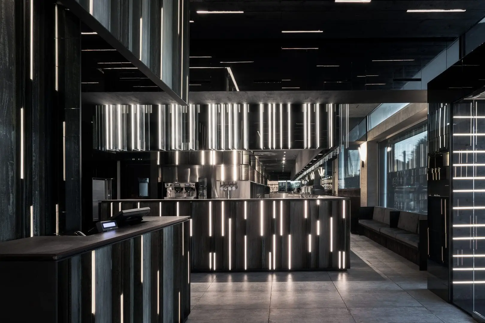 È uno spazio su due piani, capace di produrre un effetto di profondità reale, al centro del quale un’installazione luminosa si estende per la quasi totale altezza del locale, realizzando così una sorta di elemento di congiunzione e di orientamento. Alla ceramica viene affidato un ruolo centrale, sul piano compositivo, non solo per l’efficacia delle prestazioni, ma soprattutto per la presenza di un maxi-formato, dove l’effetto legno risponde in modo coerente alla luminosità diffusa. Il lavoro dimostra un grande controllo nella distribuzione degli spazi, senza mai perdere di vista la regia generale di un ambiente teatrale e funzionale.
