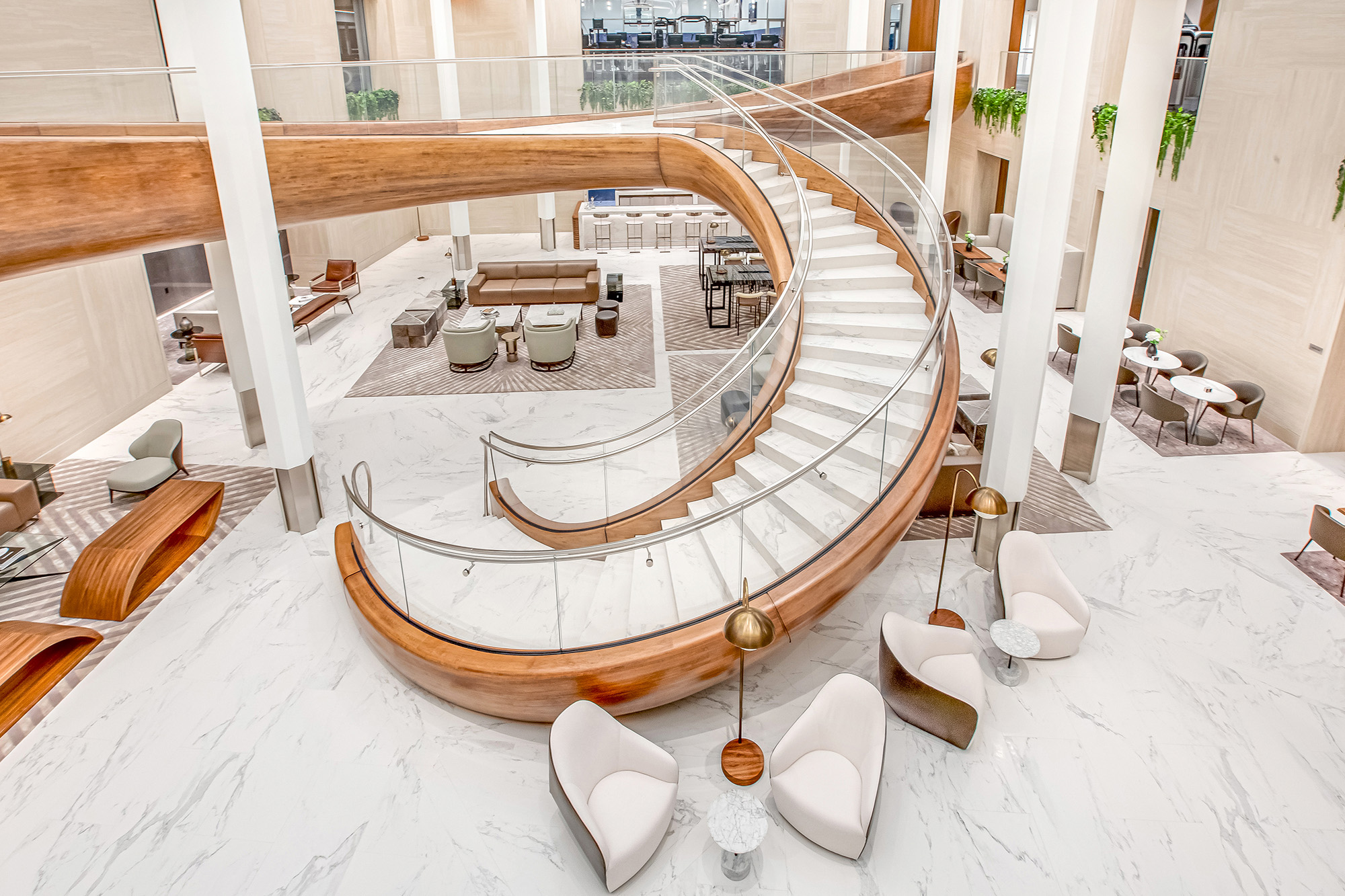 A luxury multi-family residential development on the Upper West Side of Manhattan, the Waterline Square Luxury Condominiums consist of three high-rise towers in a prime waterfront location on the Hudson River. Rockwell Group designed The Waterline Club – a comprehensive amenity space for residents that connects the complex’s three main buildings. Inside, among sweeping expanses and lofty ceilings, amenities include an indoor tennis court, basketball court, rock-climbing wall, fitness center, 25-meter lap pool, game room, art studio, and countless more offerings for residents of all ages. With durability and elegance in mind, the designers selected large-format marble- and stone-look porcelain tiles by Florim to cover the walls and floors throughout the high-traffic lobby and peripheral lounge areas. Non-slip quartzite-effect tiles surround and line the inside of the pool, and statuario-esque porcelain tiles bring grandeur to the walls. Finally, a dark marble-effect porcelain slab from the brand’s Florim Stone range composes the bar top and backsplash area in the space’s party room.