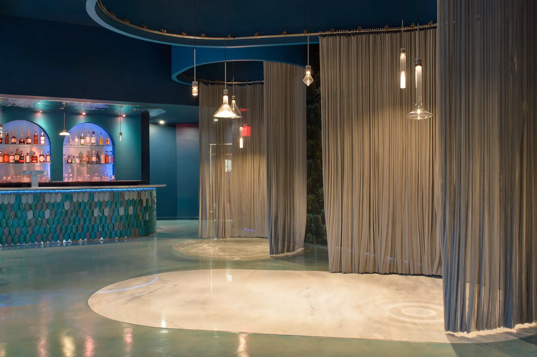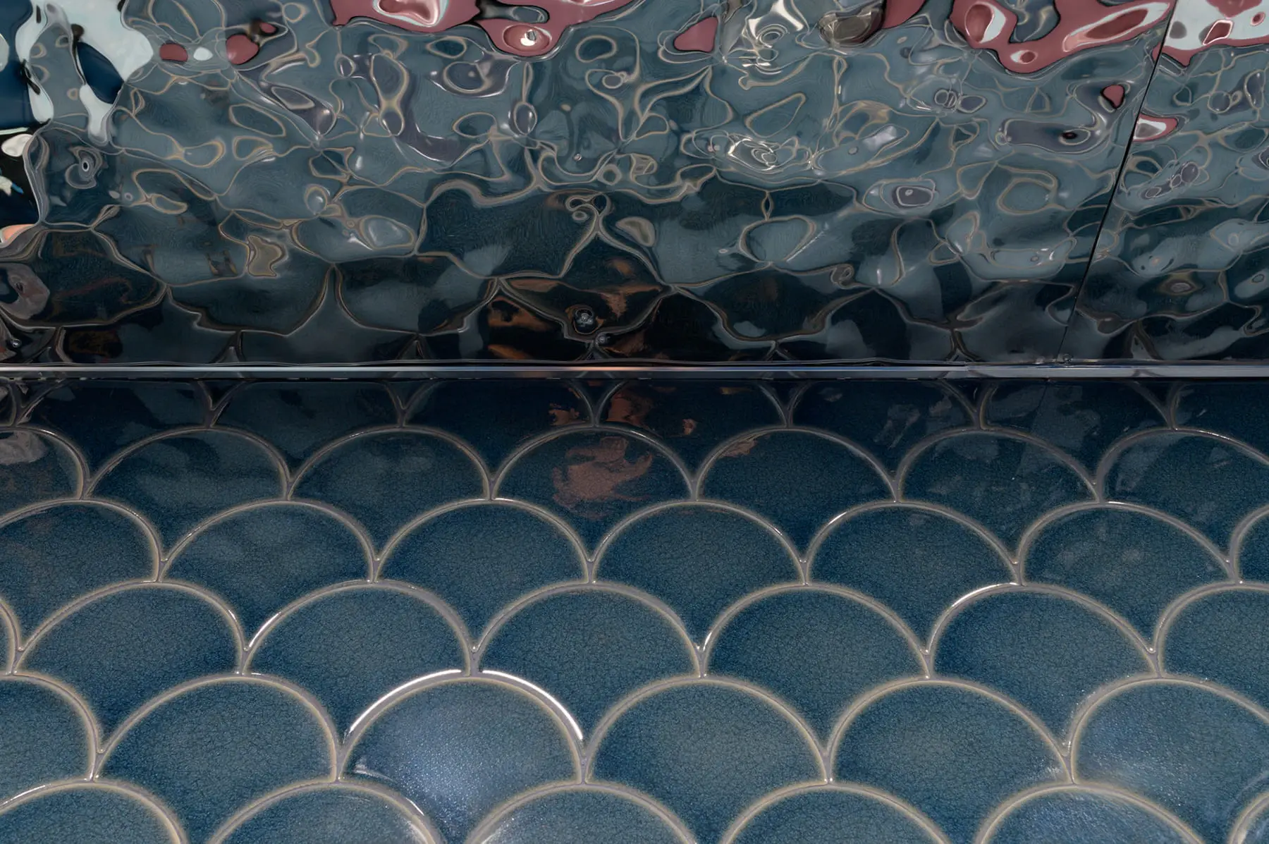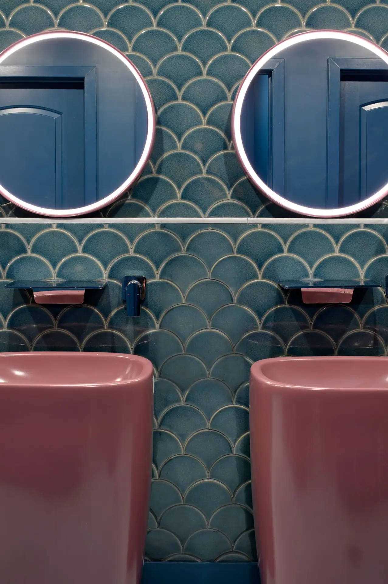 Tikka Charcoal Grill by Olbos Studio brings a sensory underwater world to life through immersive design and vibrant materiality. The restaurant’s focal point – a sculptural bar wrapped in overlapping, three-dimensional Calathea tiles by AcquarioDue – echoes the movement of water in four oceanic blues. Throughout the space, marine-inspired tones and forms create intimate dining zones enclosed in pill-shaped volumes that glow like lanterns behind translucent curtains. In the bathrooms, AcquarioDue’s tiles again make a bold impression – from peachy tones and warm golden hues to dark blue tiles complemented by coral colored sinks. Each thoughtfully-curated space continues the aquatic narrative, emphasized by metallic water ripple panels applied across the bathroom ceilings.
