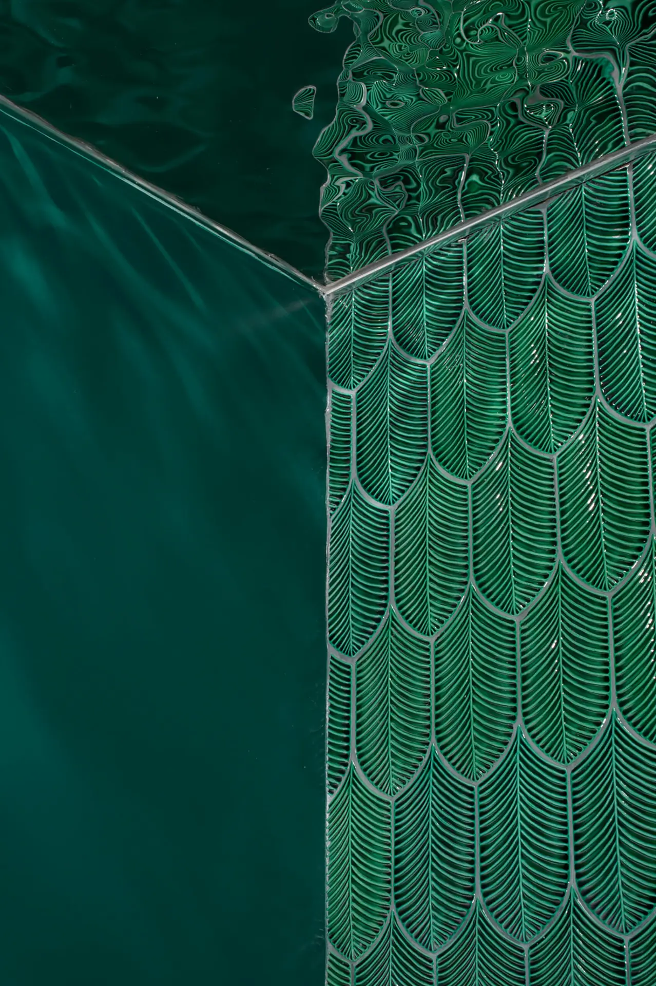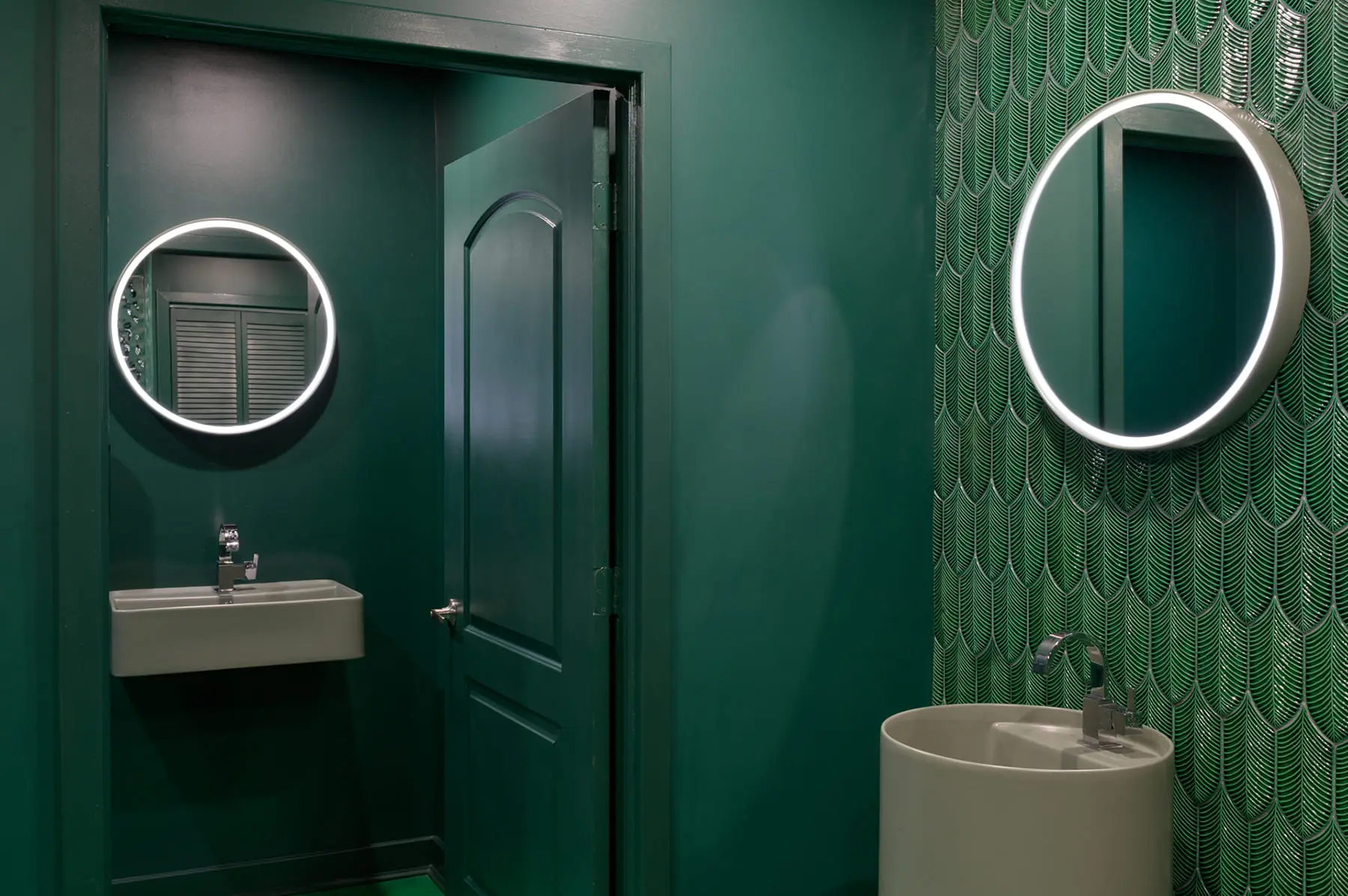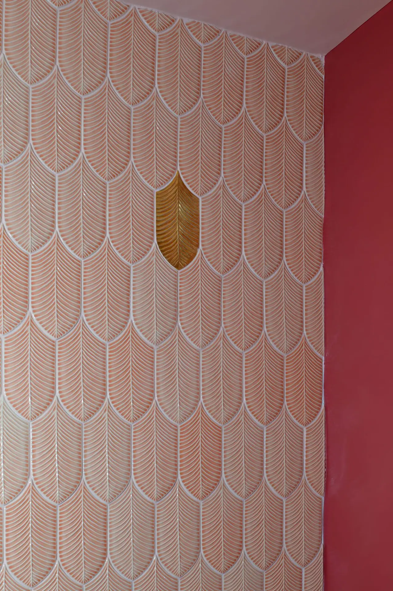 Tikka Charcoal Grill by Olbos Studio brings a sensory underwater world to life through immersive design and vibrant materiality. The restaurant’s focal point – a sculptural bar wrapped in overlapping, three-dimensional Calathea tiles by AcquarioDue – echoes the movement of water in four oceanic blues. Throughout the space, marine-inspired tones and forms create intimate dining zones enclosed in pill-shaped volumes that glow like lanterns behind translucent curtains. In the bathrooms, AcquarioDue’s tiles again make a bold impression – from peachy tones and warm golden hues to dark blue tiles complemented by coral colored sinks. Each thoughtfully-curated space continues the aquatic narrative, emphasized by metallic water ripple panels applied across the bathroom ceilings.