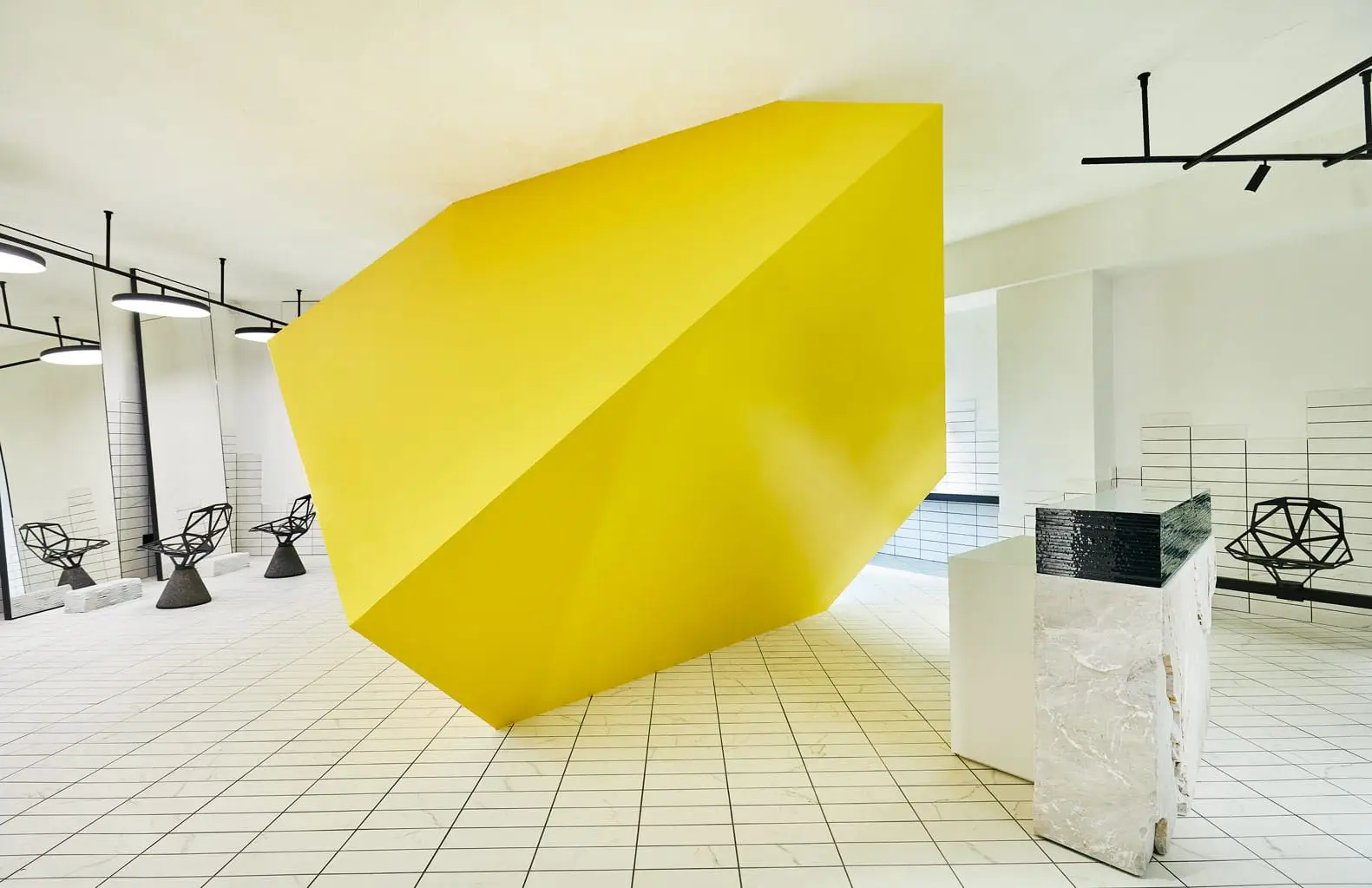 Tutte le funzioni fondamentali di un salone di bellezza sono state rispettate. Da un lato, le piastrelle utilizzate producono un effetto quaderno, rassicurante e atteso all’interno di uno spazio dal quale ci aspettiamo una serie di servizi. La piastrella ha garantito da subito le giuste qualità tecniche di resistenza all’usura ed all’attacco di sostanze acide, oltre che il vantaggio di fornire allo spazio una superficie facilmente igienizzabile. Dall’altro lato, un improvviso e inaspettato cubo giallo che occupa il centro dello spazio, che funge da quinta agli aspetti funzionali di un tradizionale salone di bellezza.